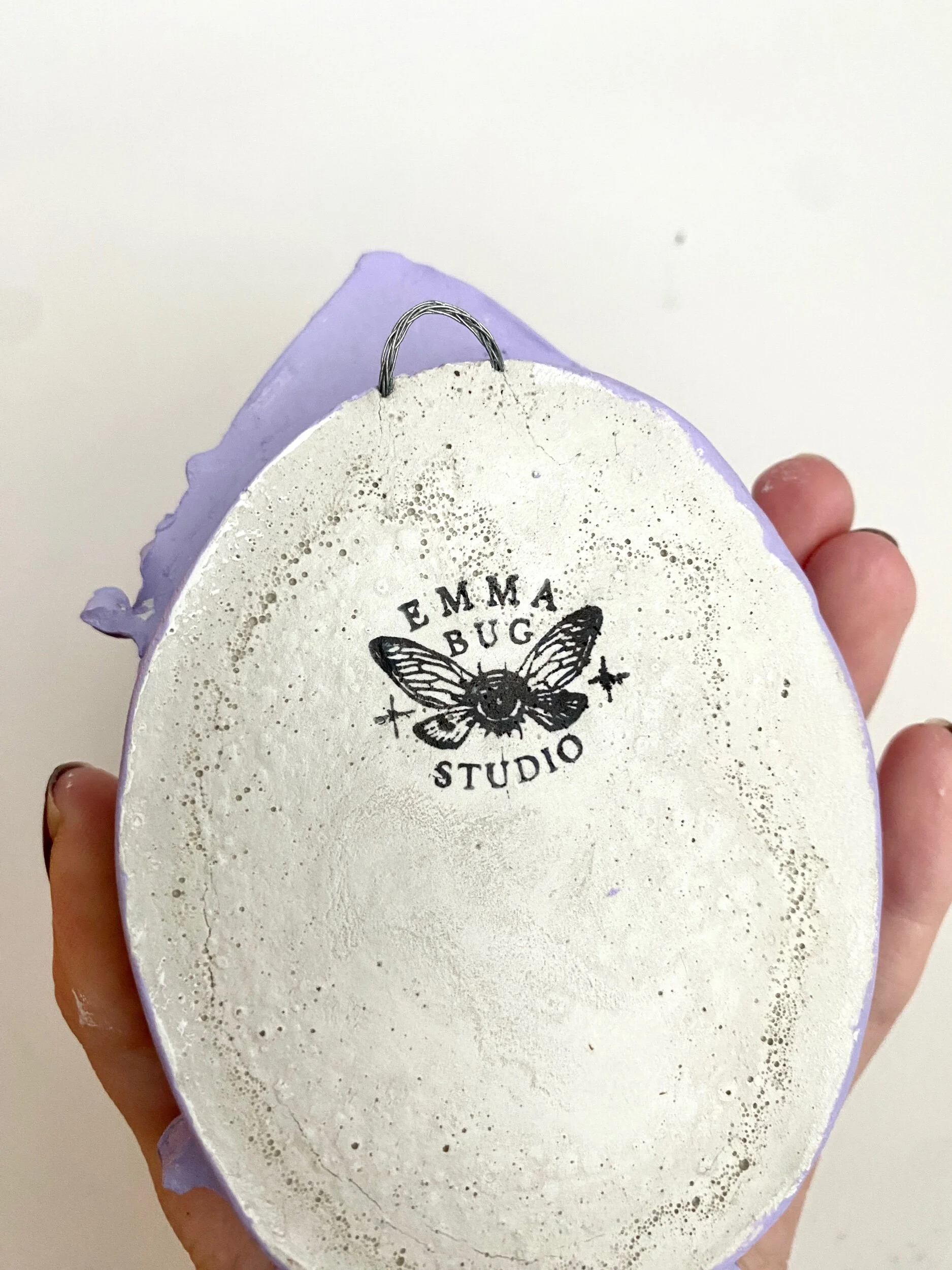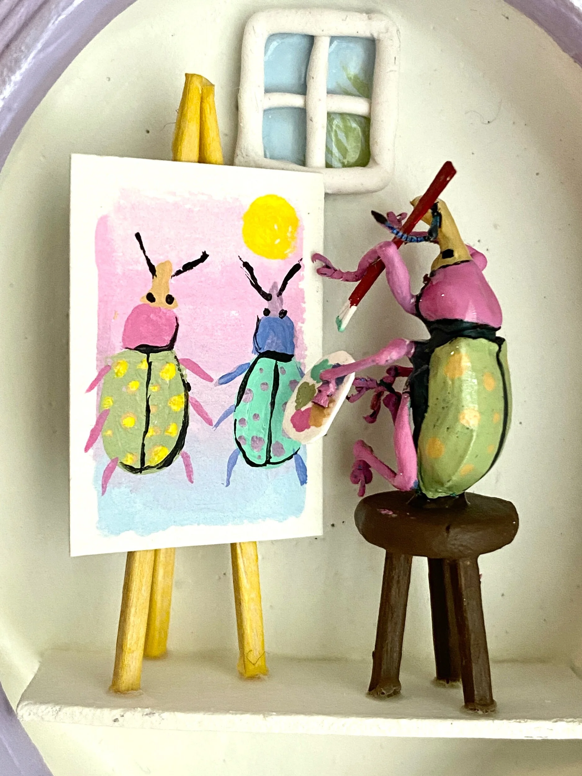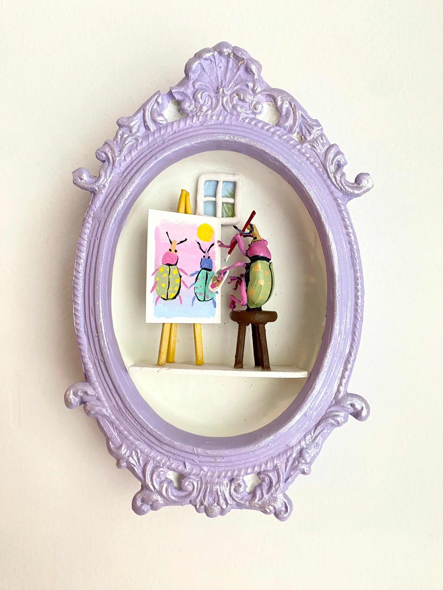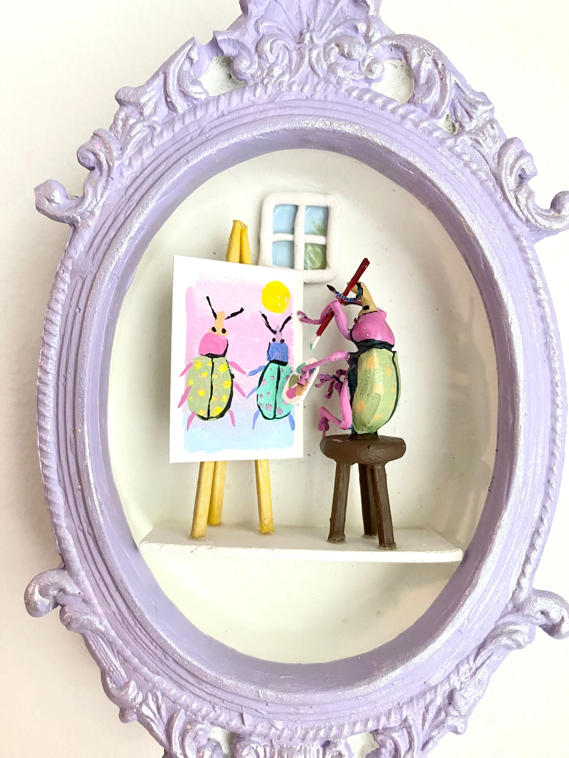 This handmade arched frame features one (real) weevil insect in a pastel bathroom setting. It features a hand sculpted sink, toilet, toilet paper roll, framed mirror, stool, plunger, and shelf with miniature toiletries. The outside of this frame is black, the inside tile is light blue.