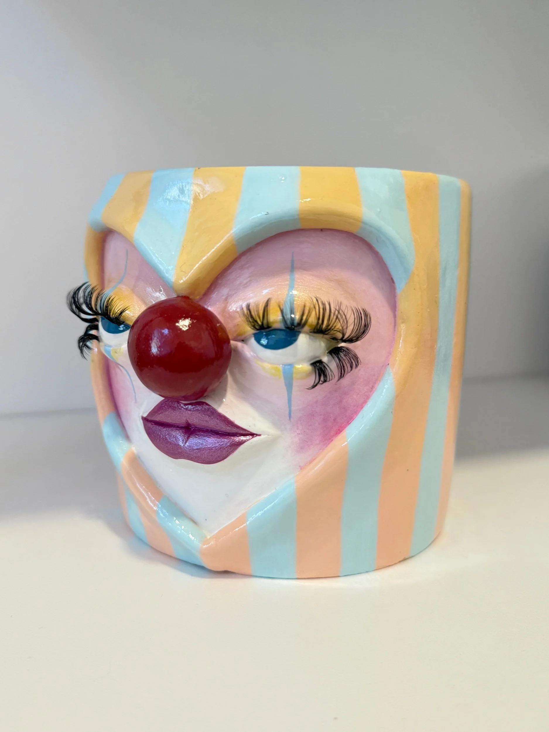 This pot features pastel stripes, a clown face, and long fluffy eyelashes.