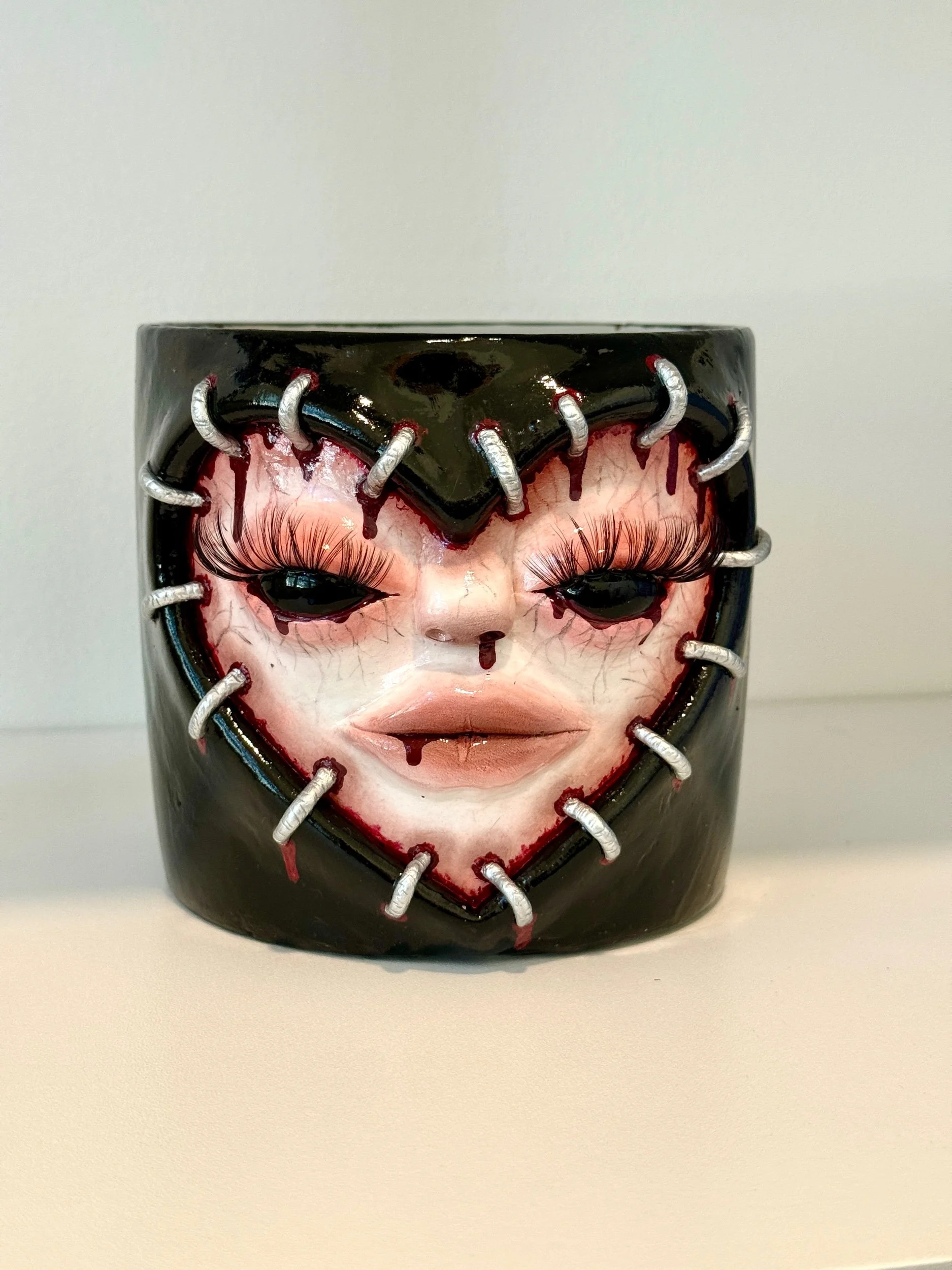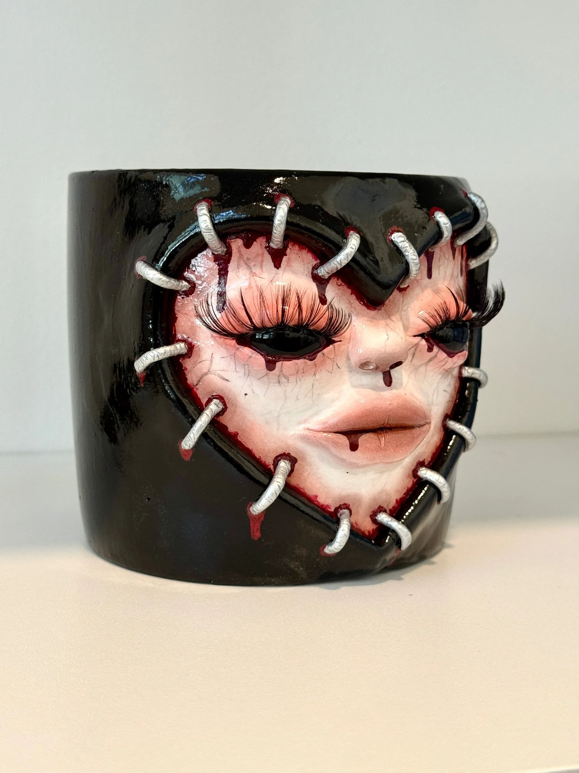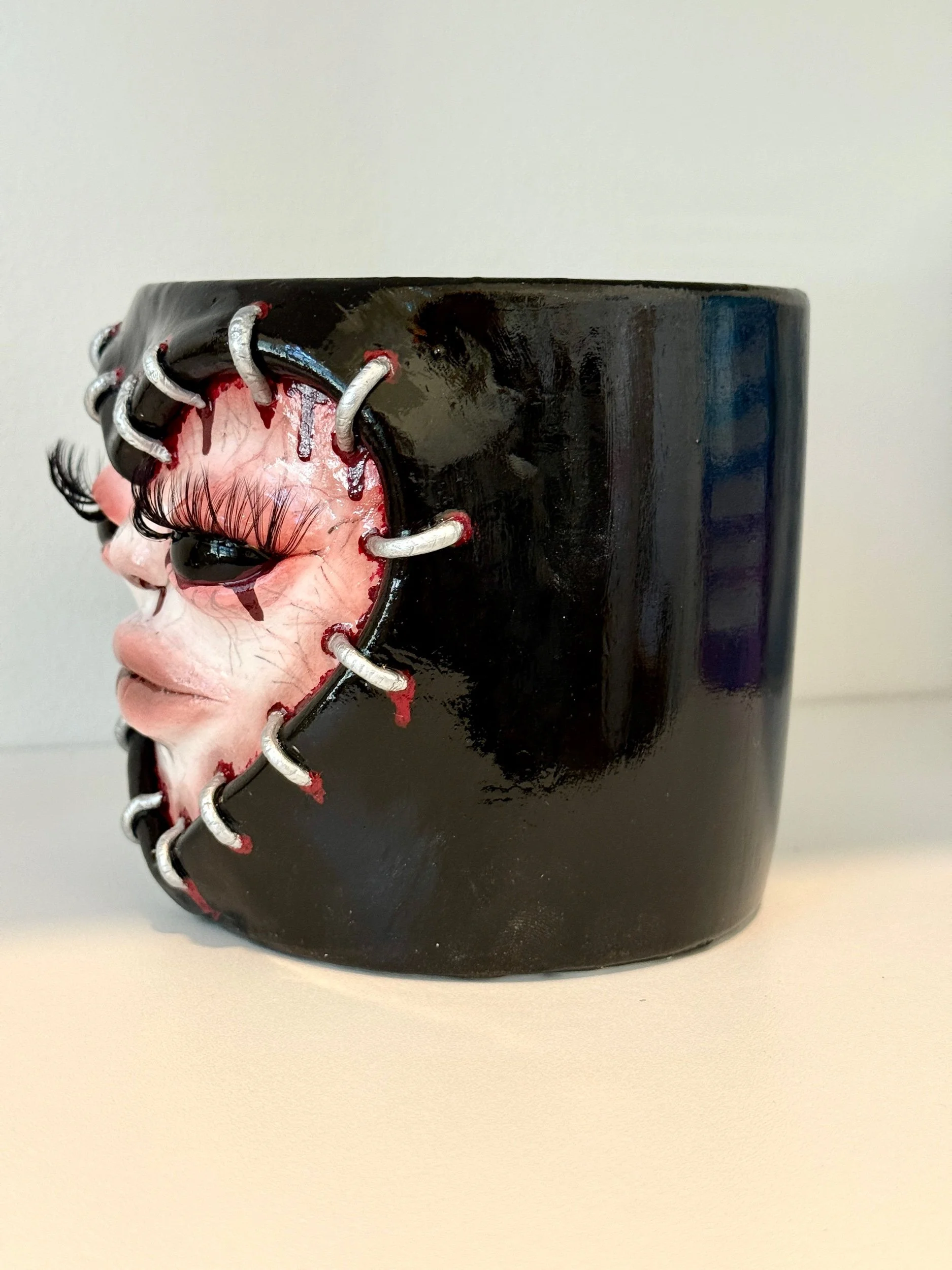 Don’t look into her eyes too long. This pot features 3D stitching around the face, veiny pale skin, and piercing black eyes framed by wispy eyelashes.