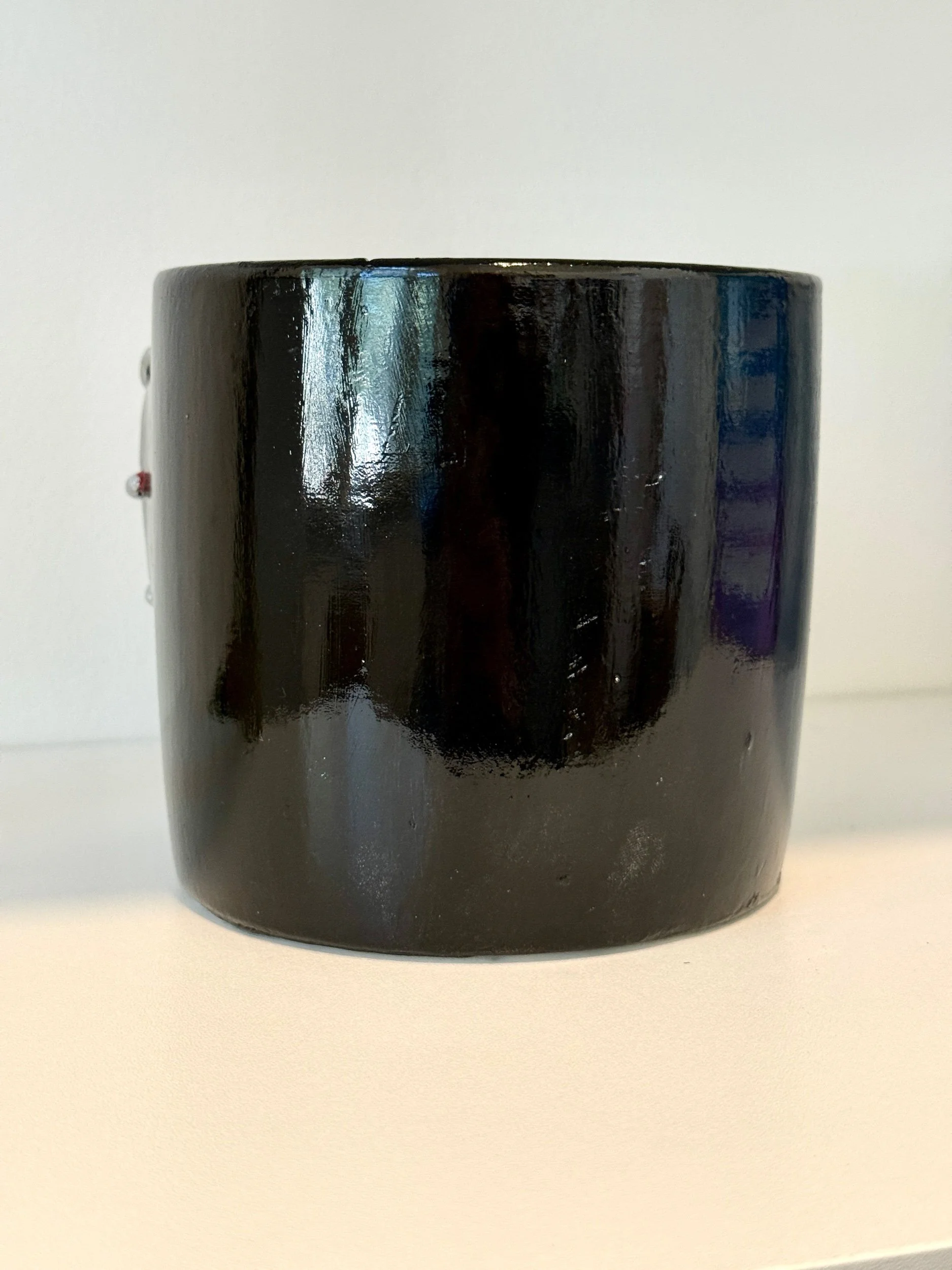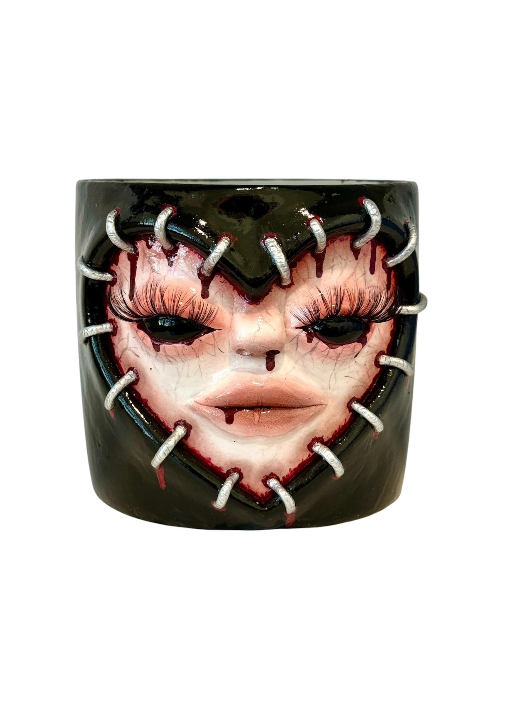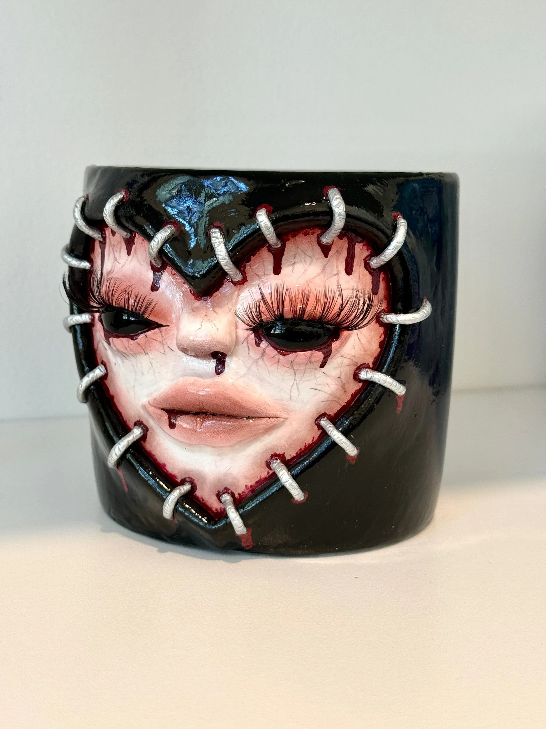 Don’t look into her eyes too long. This pot features 3D stitching around the face, veiny pale skin, and piercing black eyes framed by wispy eyelashes.