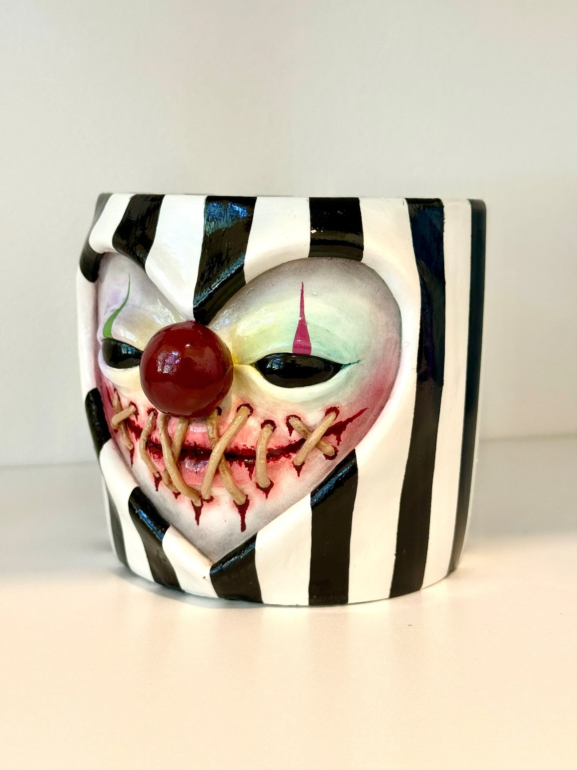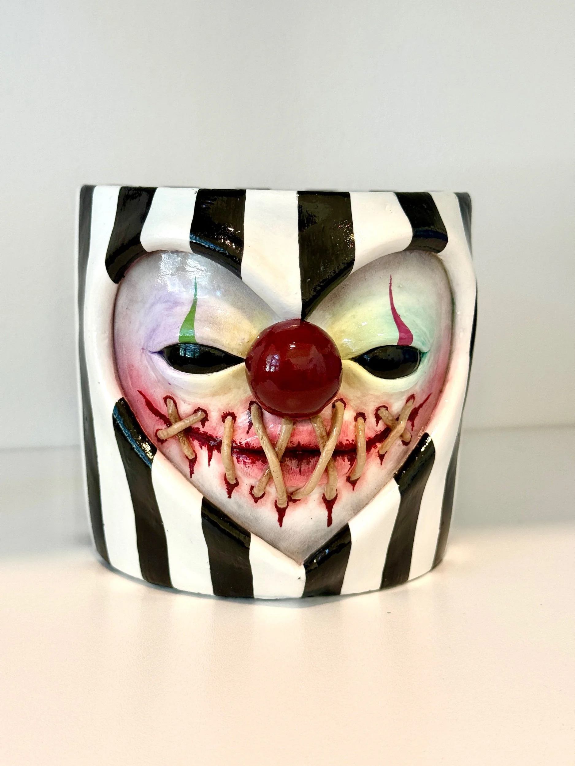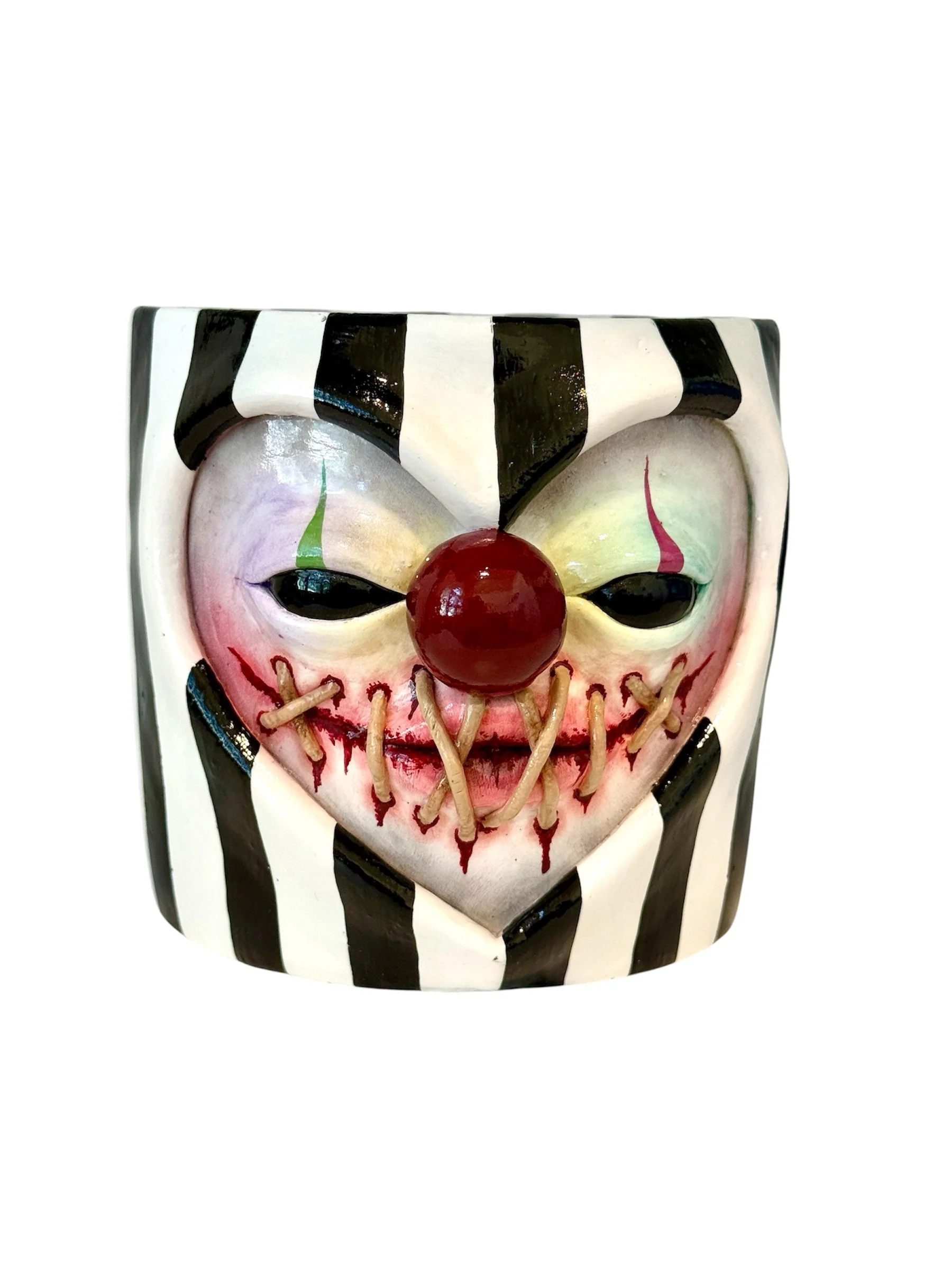 This pot features 3D stitching around a bloody ripped mouth (cute!), a bulbous clown nose, and whimsical black & white stripes.