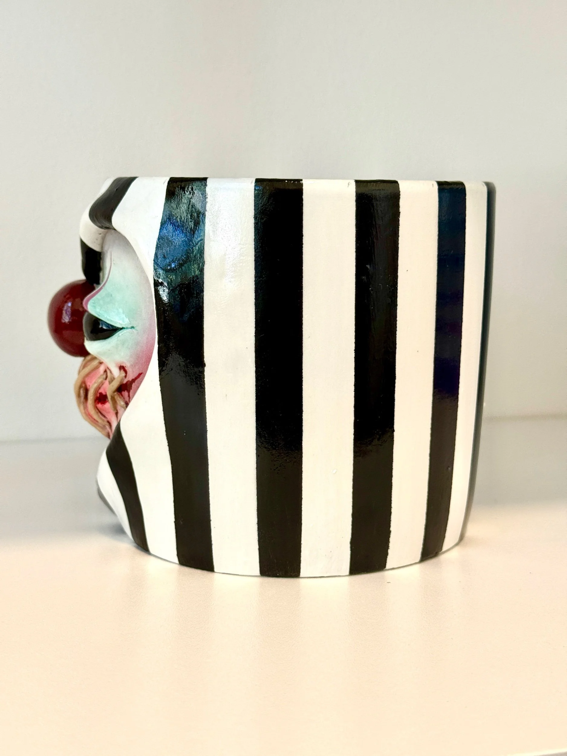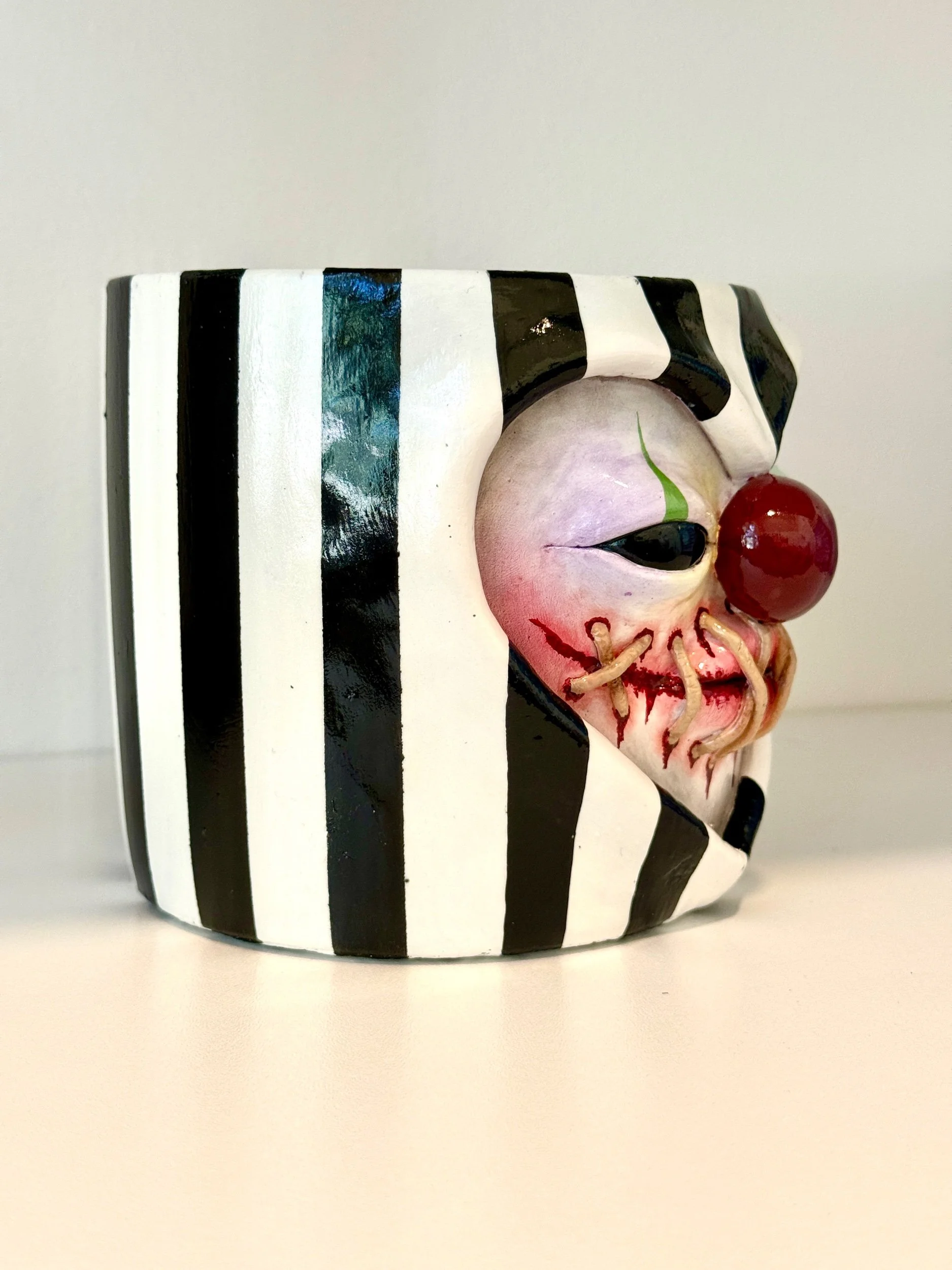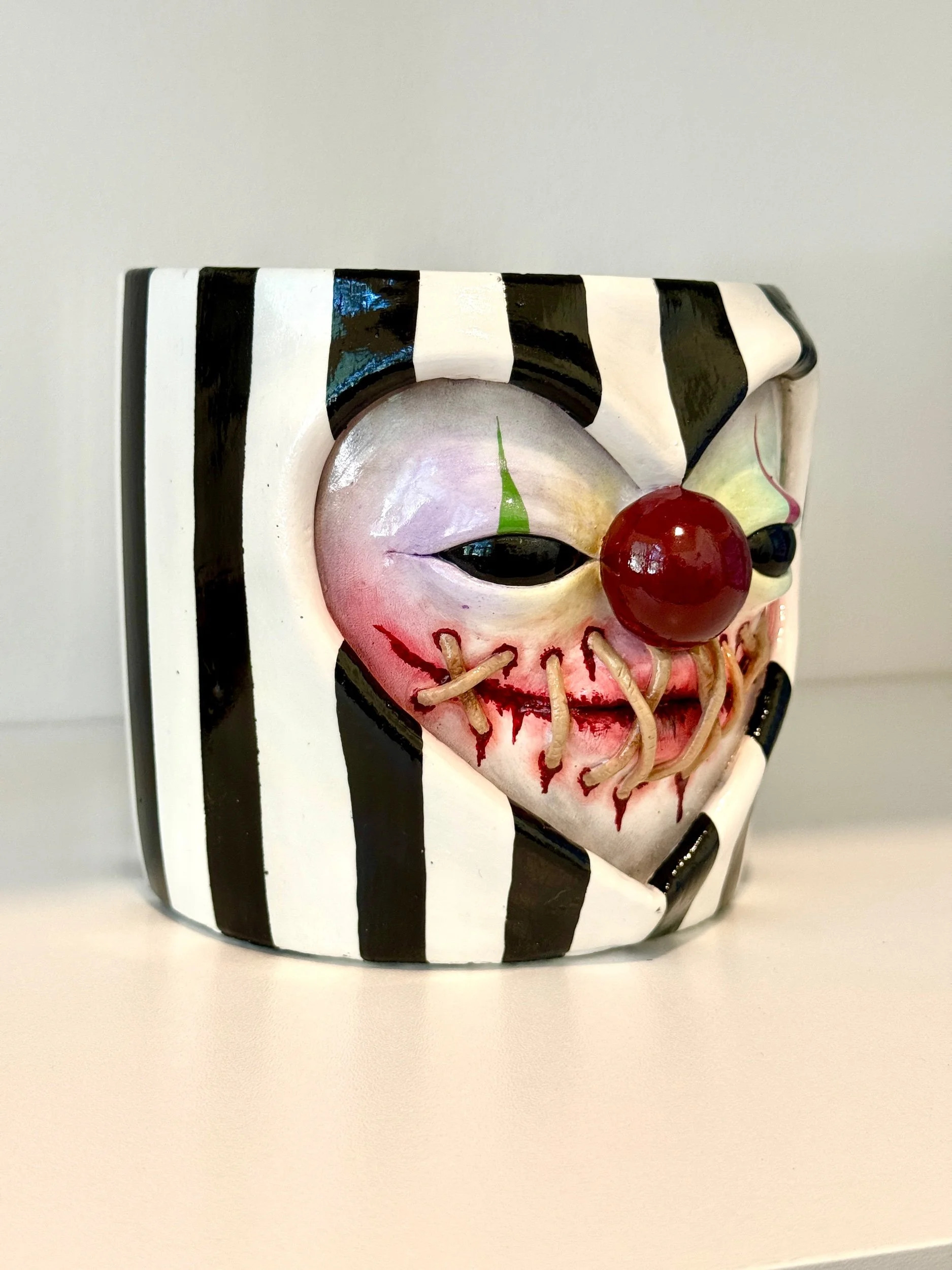 This pot features 3D stitching around a bloody ripped mouth (cute!), a bulbous clown nose, and whimsical black & white stripes.