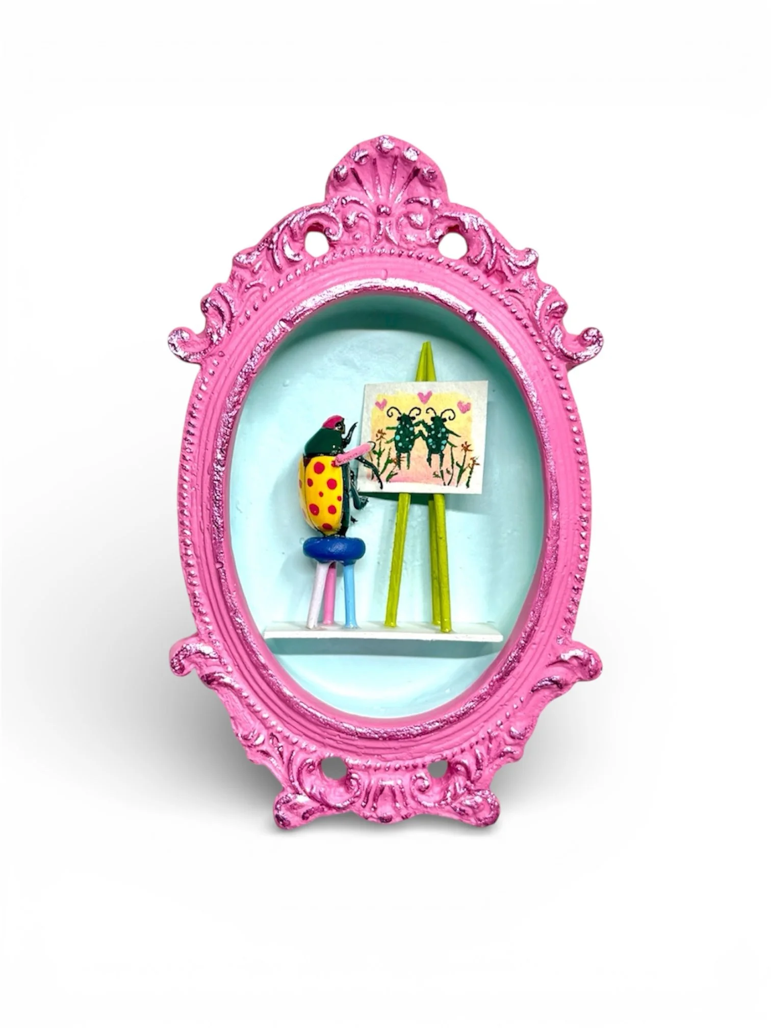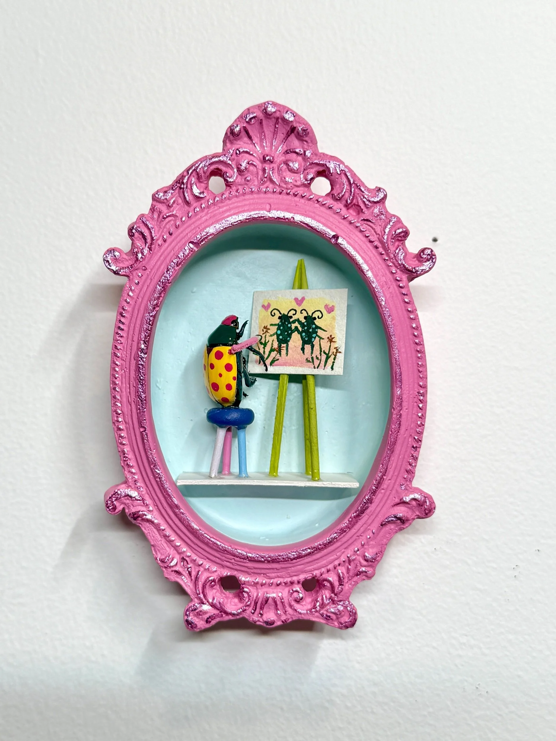 This handmade frame features a real insect, tiny window, easel, and tiny stool. The bug is holding a tiny paint brush and palette :’)