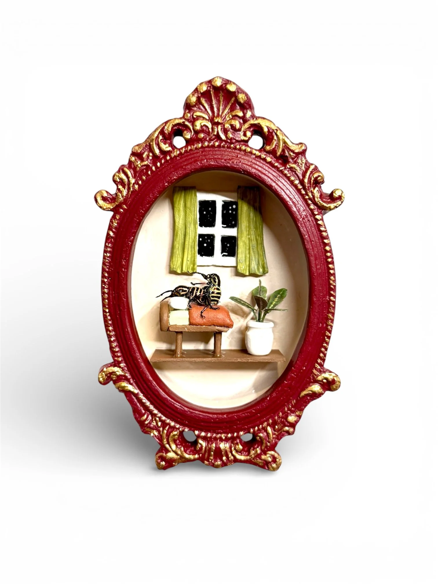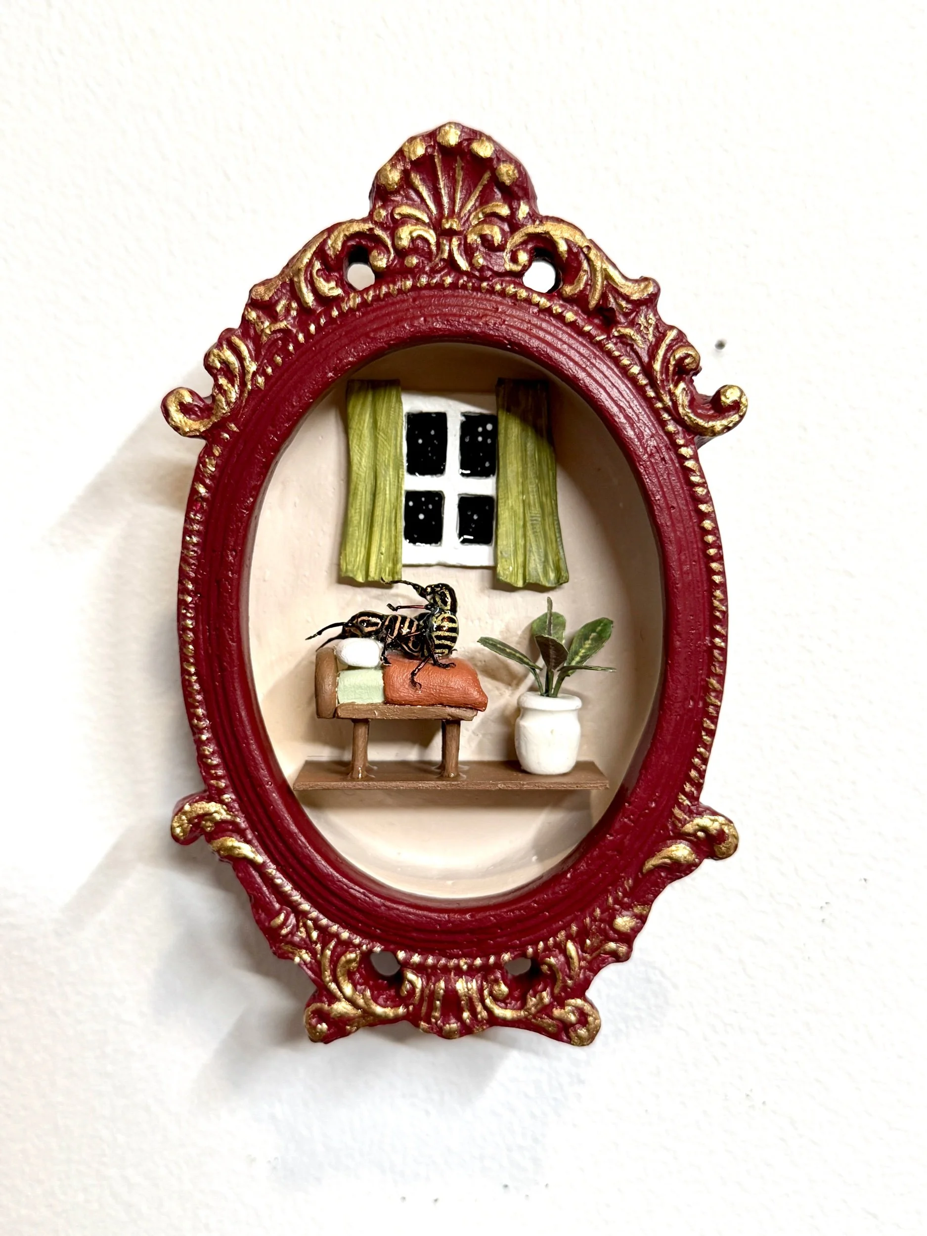 This deep red handmade frame features two real weevil insects knocking boots. It also features a mini window, a bed, and a potted plant — all made by hand.