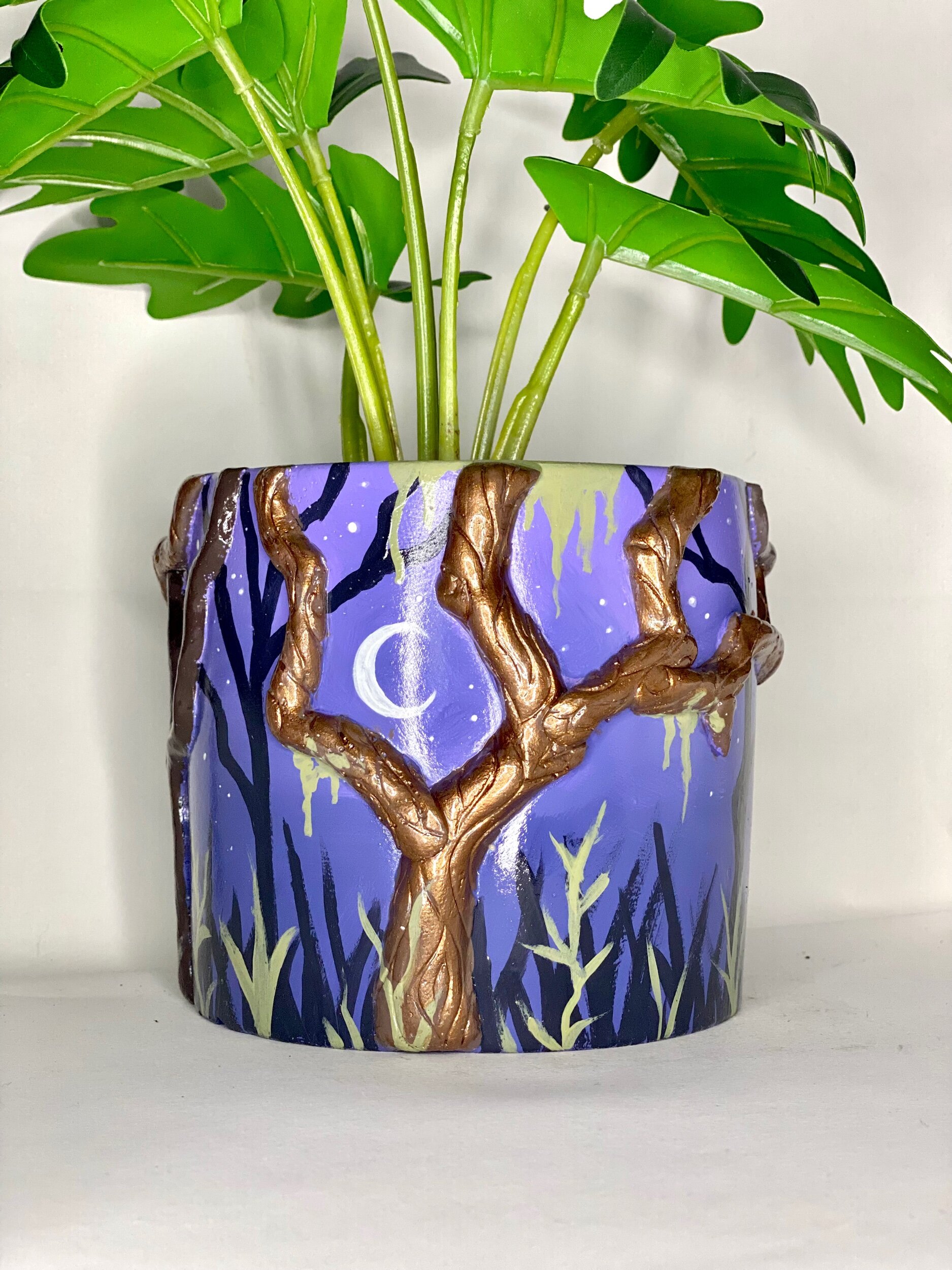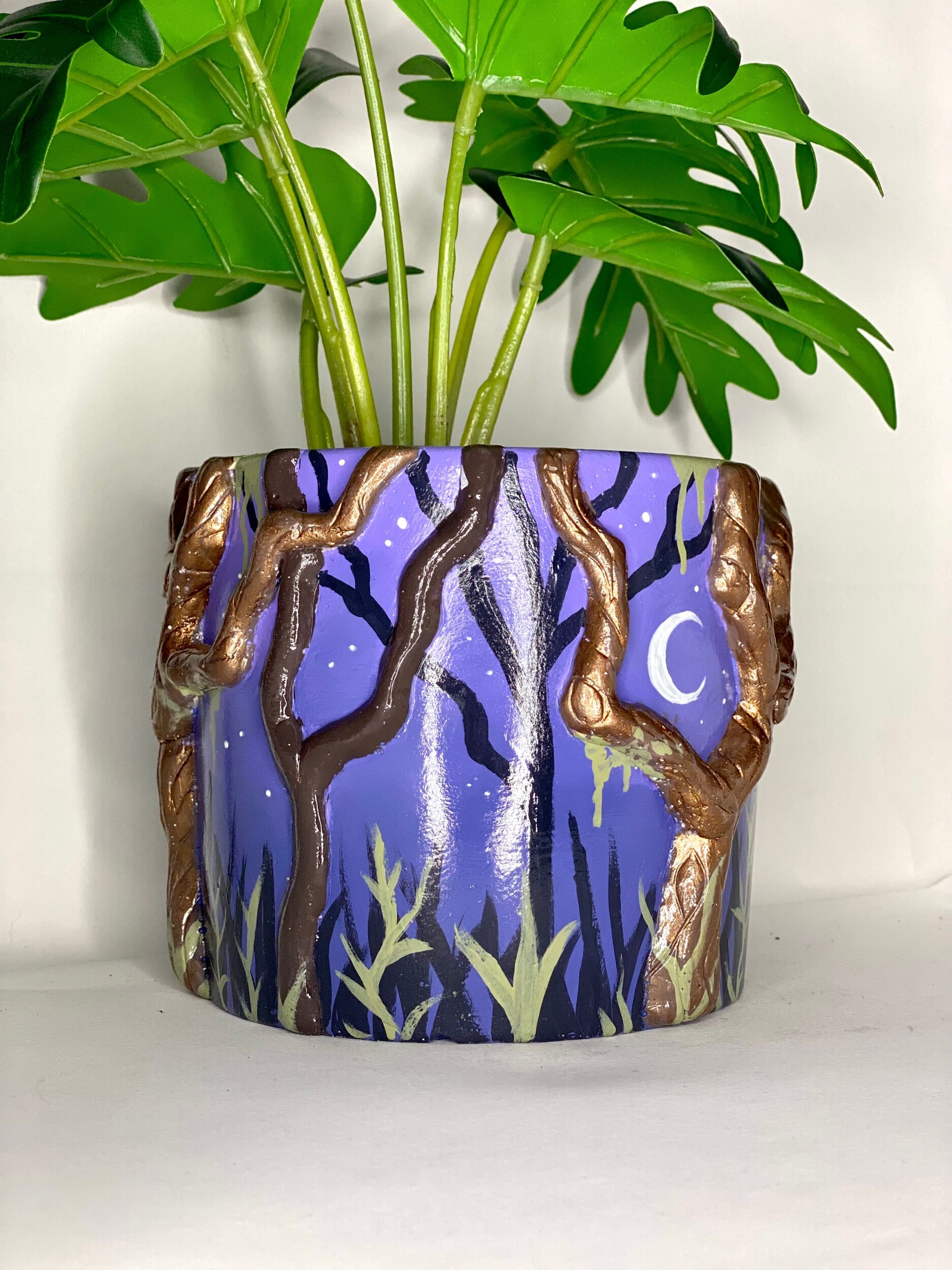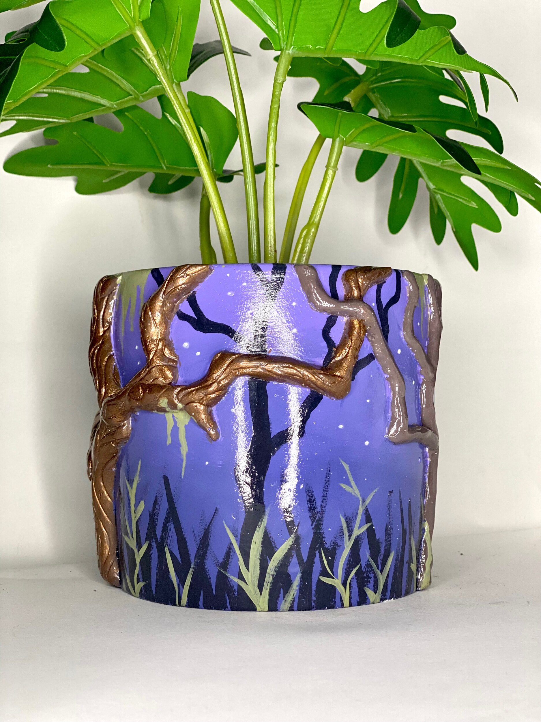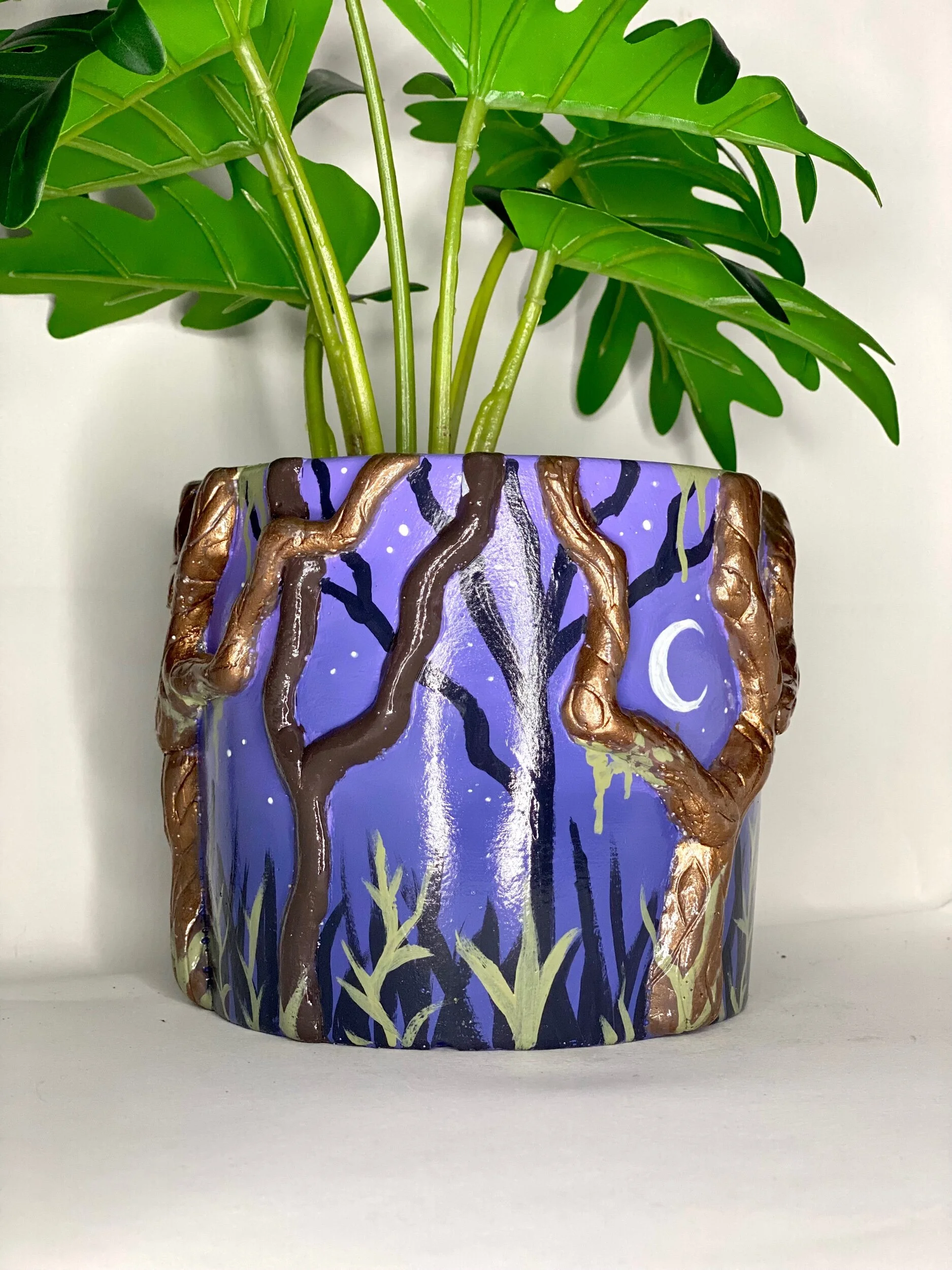This pot features metallic twisty trees and a hand-painted forest. Perfect for the spooky-at-heart.