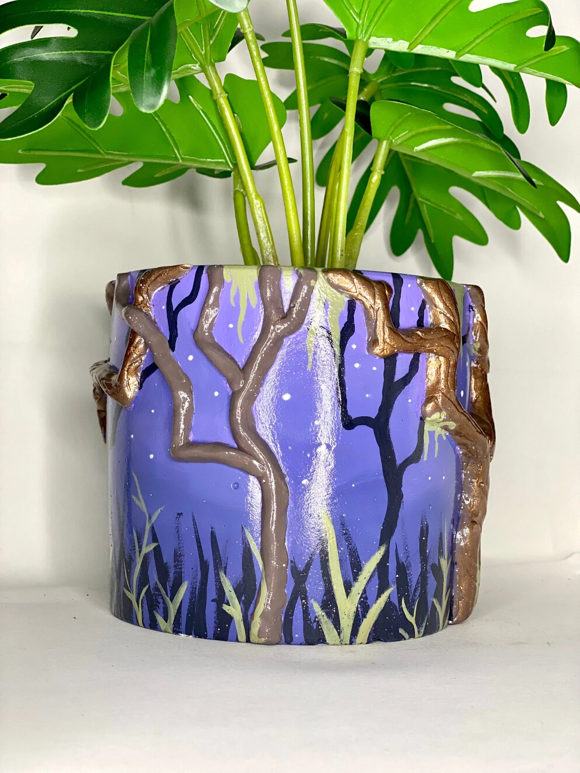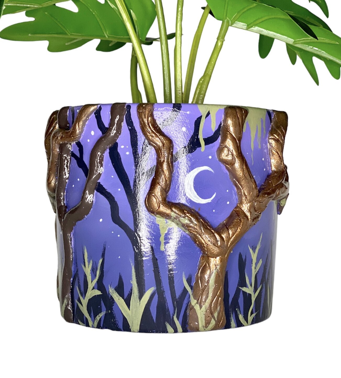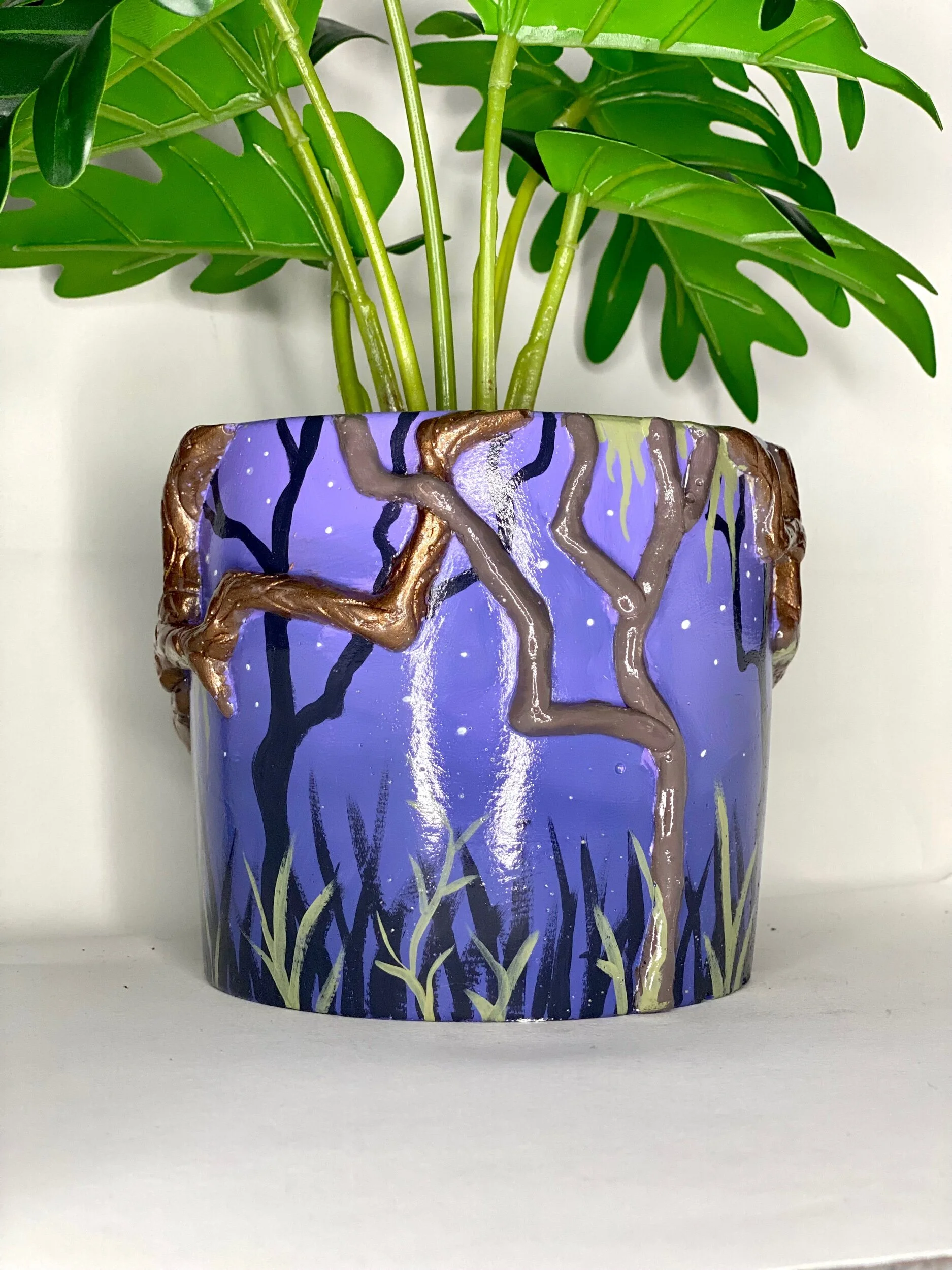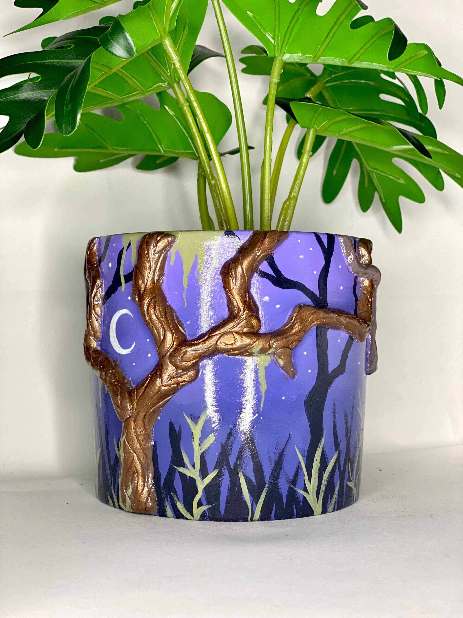This pot features metallic twisty trees and a hand-painted forest. Perfect for the spooky-at-heart.