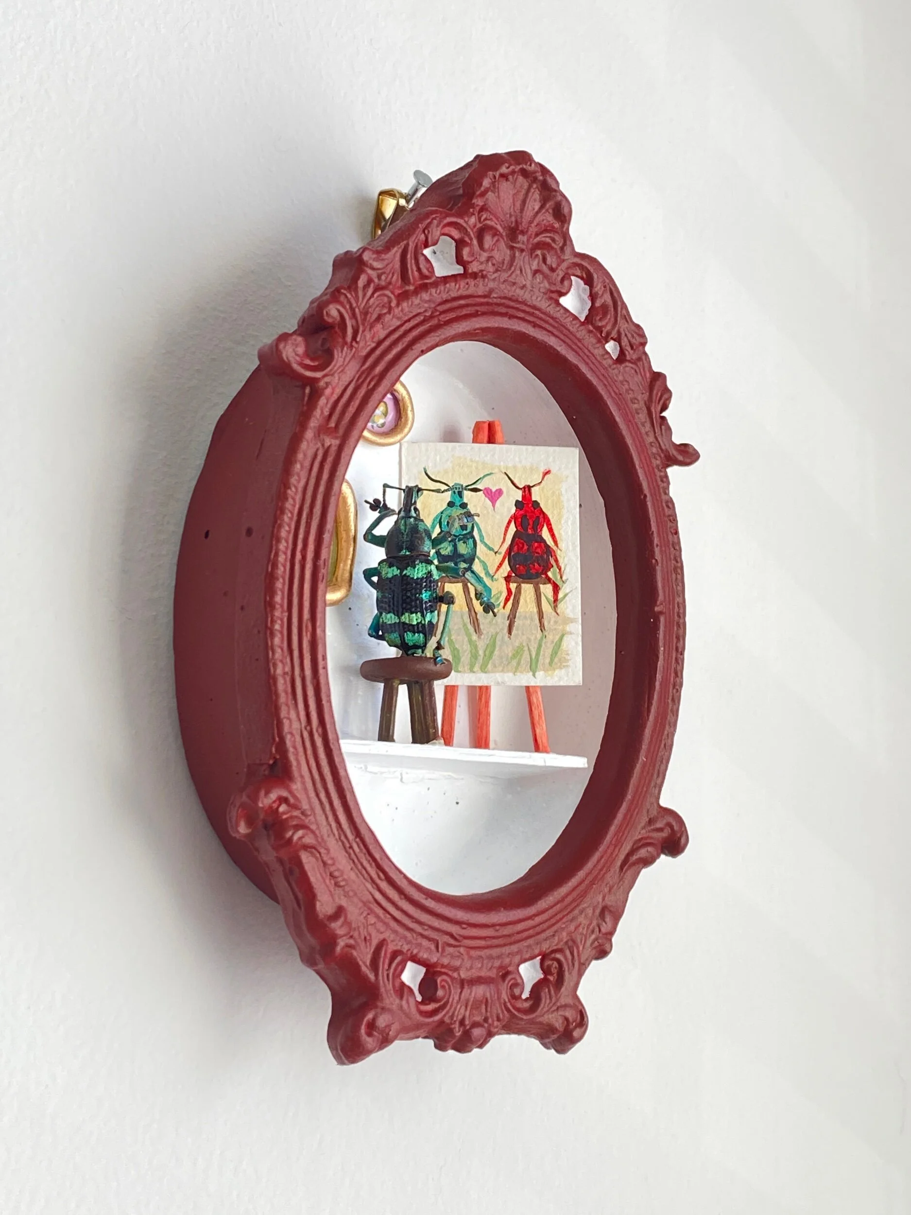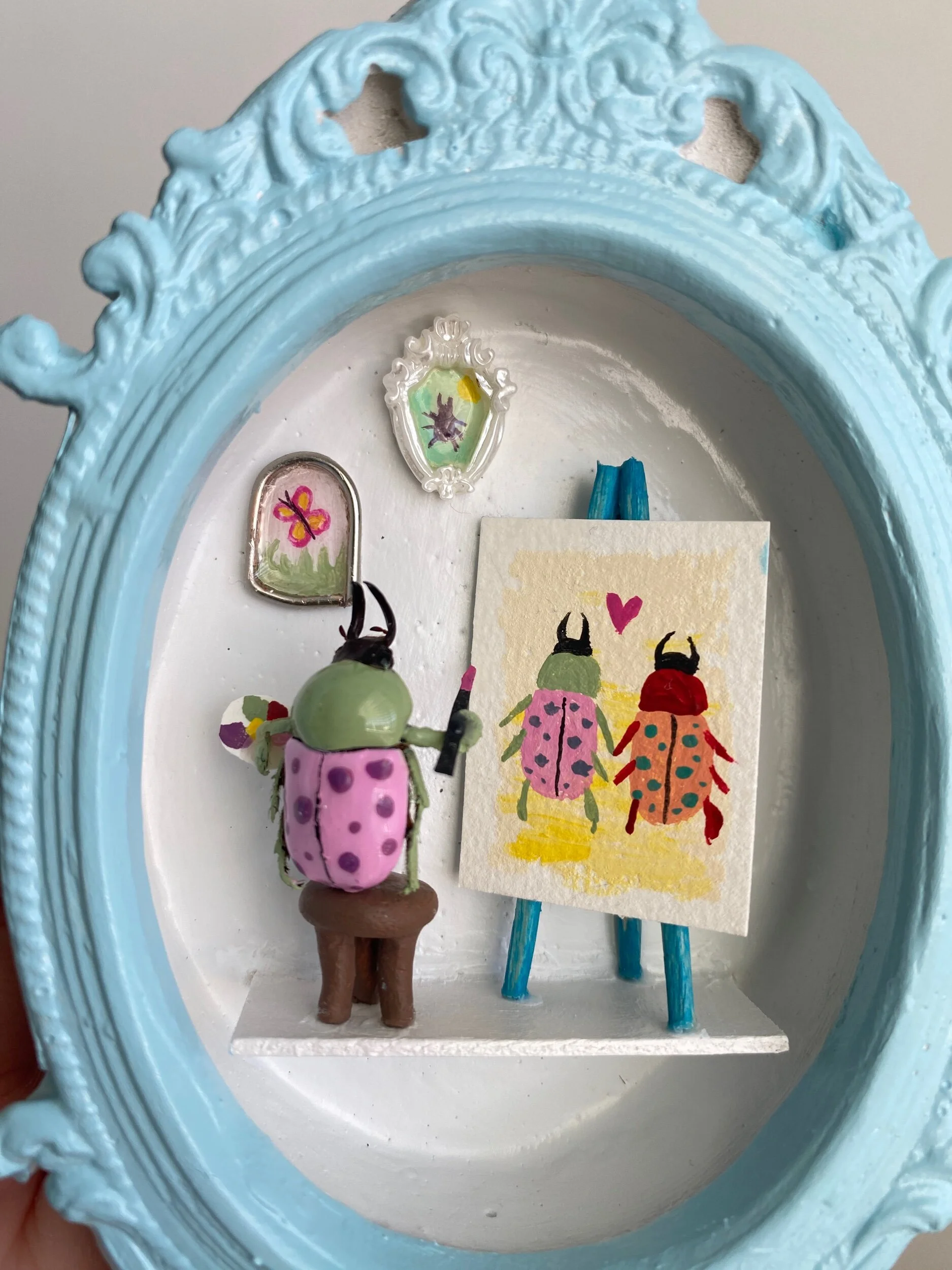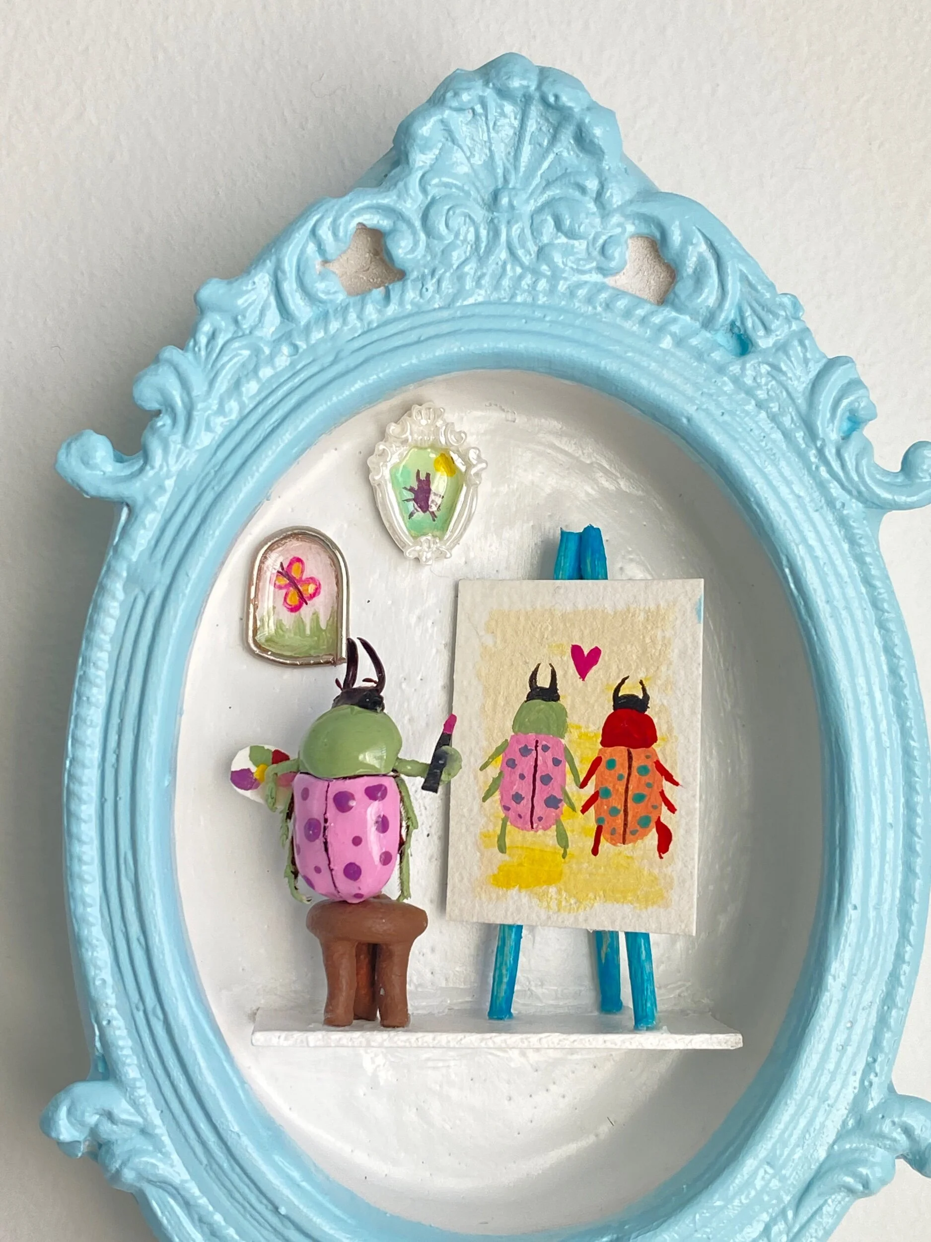 This black shadow box frame features a handmade tattoo shop scene behind glass, including 3 real insects. There is one bug artist, one bug getting tattooed, and one front desk bug. The backdrop features miniature handmade framed artwork, a shelf of plants and trinkets, and a door.