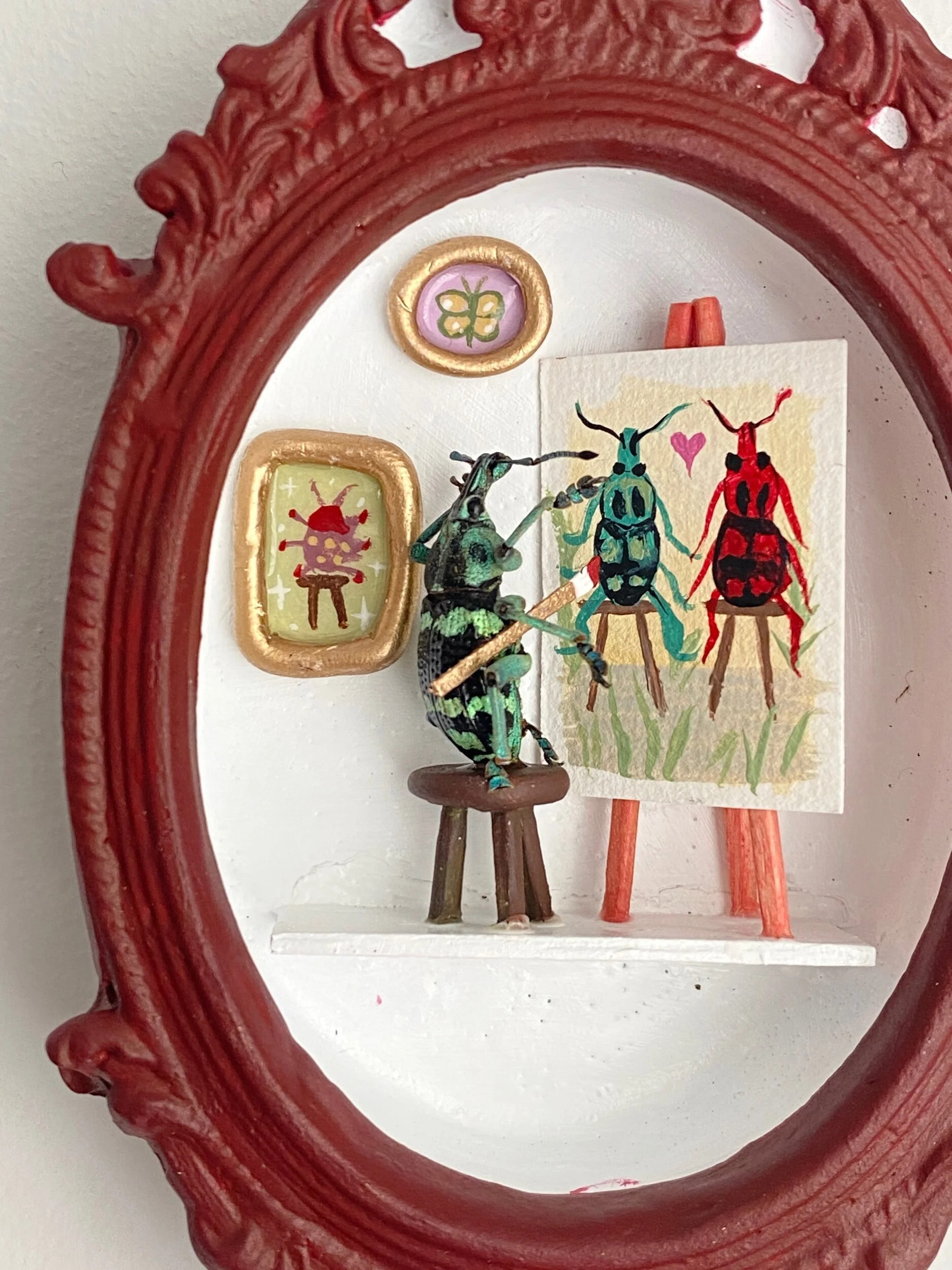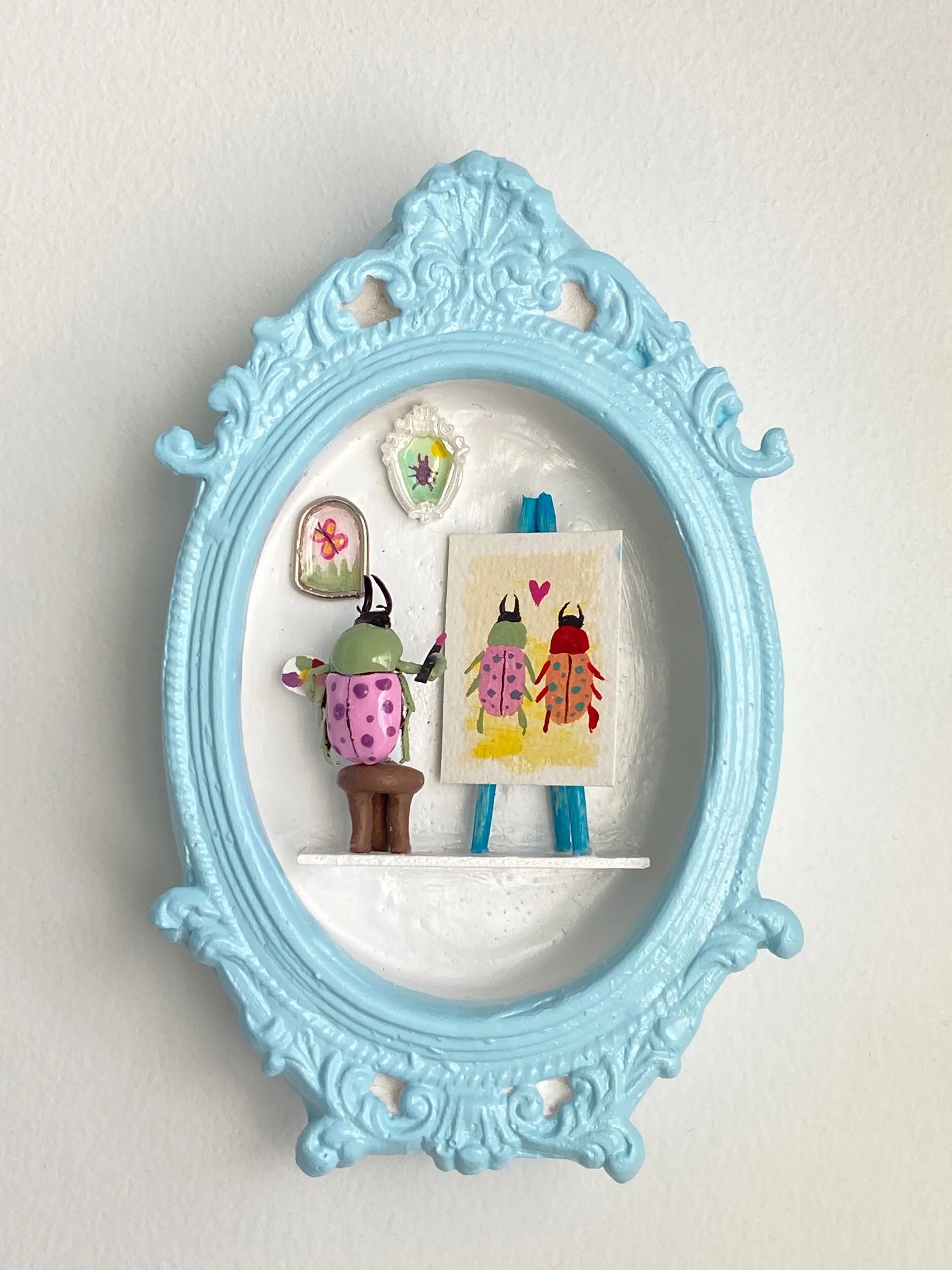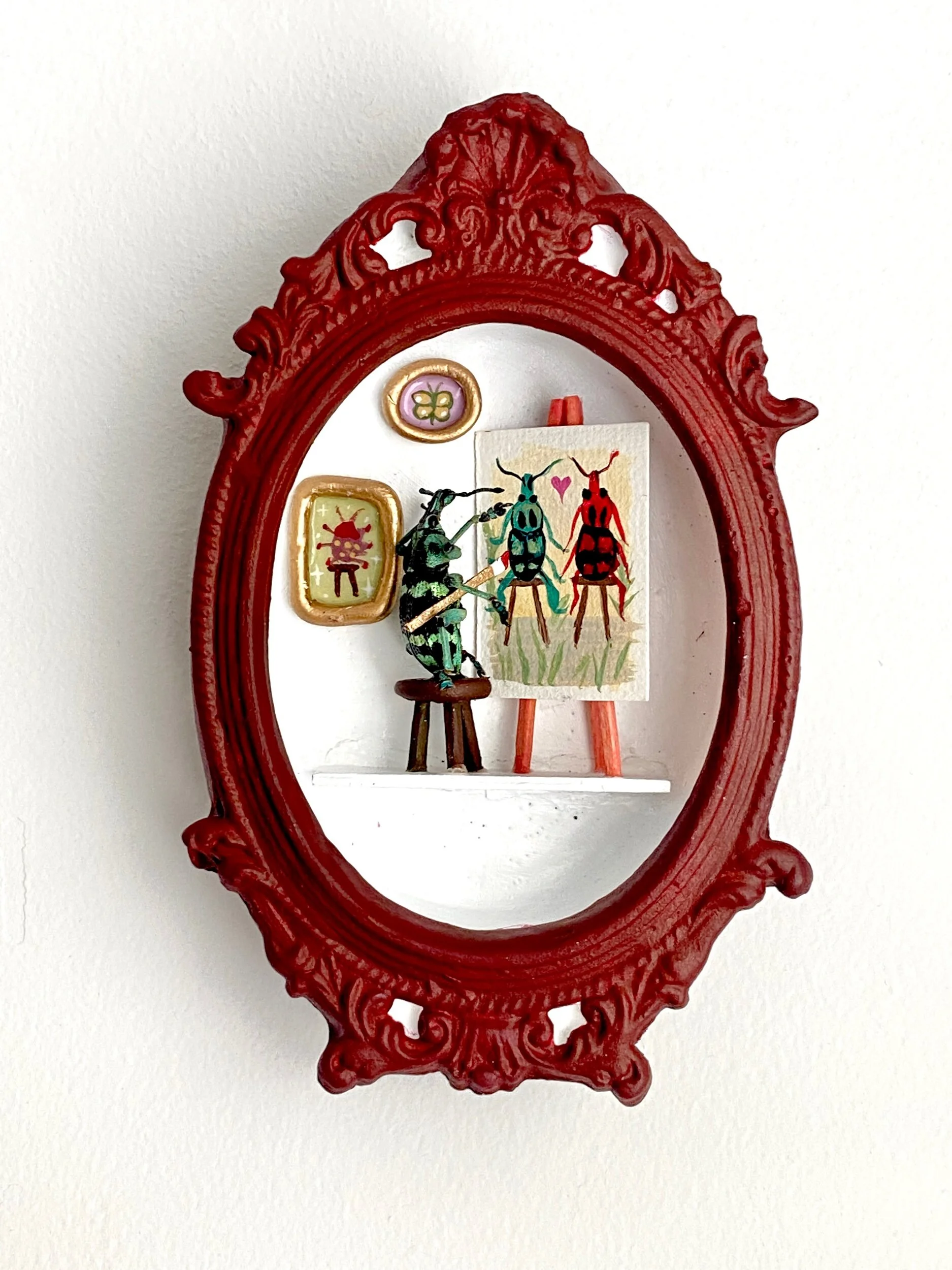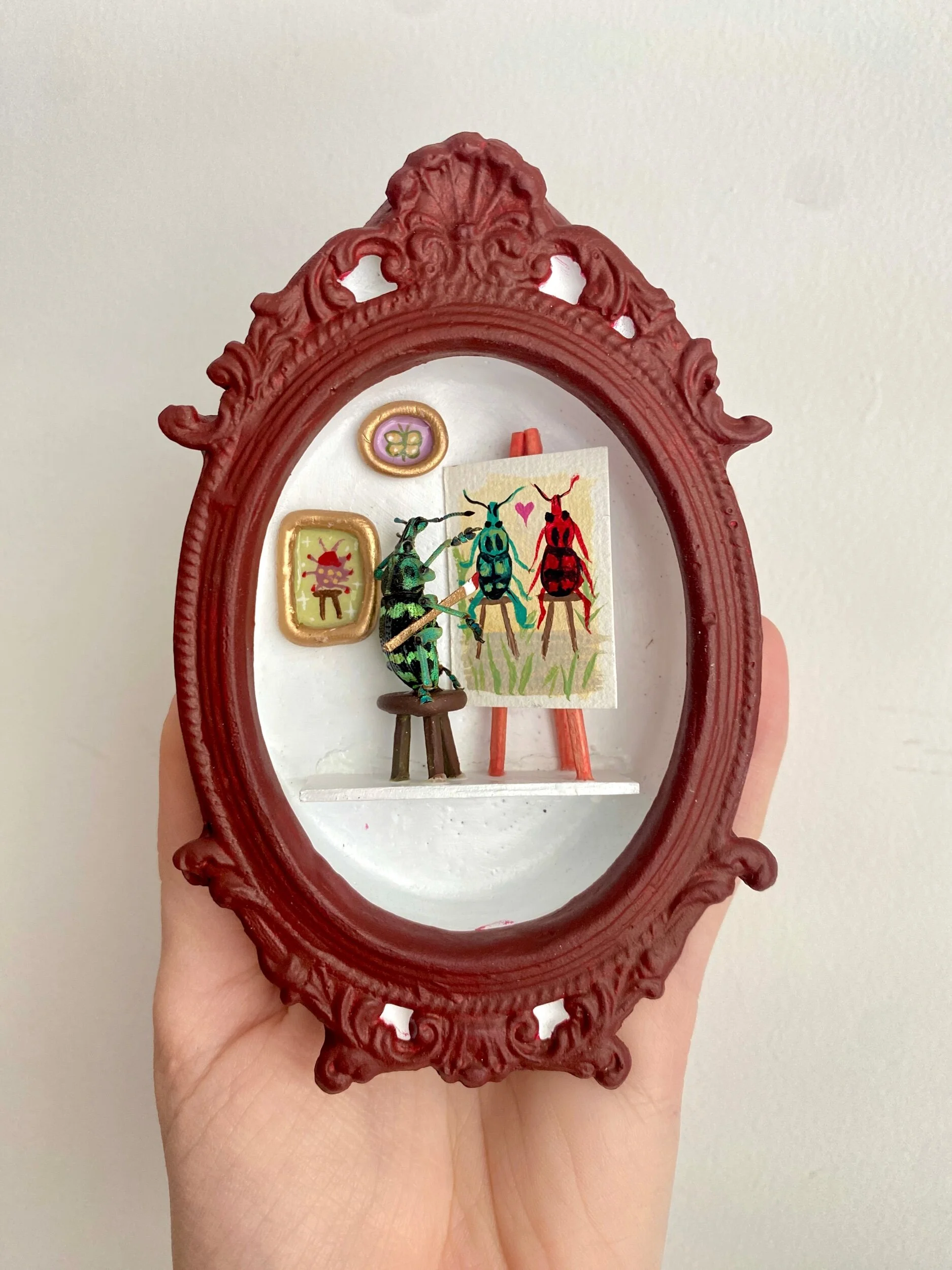 This black shadow box frame features a handmade tattoo shop scene behind glass, including 3 real insects. There is one bug artist, one bug getting tattooed, and one front desk bug. The backdrop features miniature handmade framed artwork, a shelf of plants and trinkets, and a door.