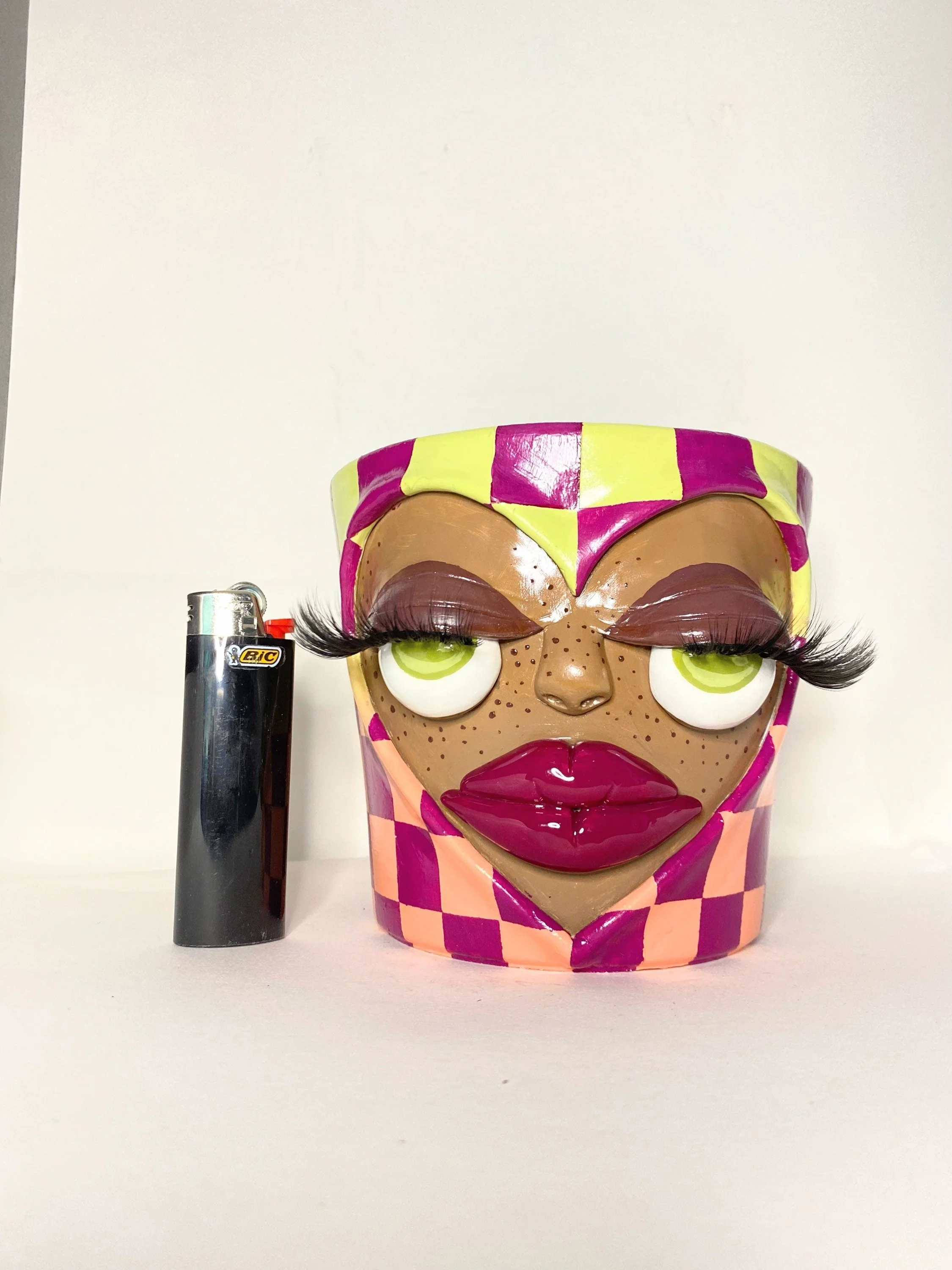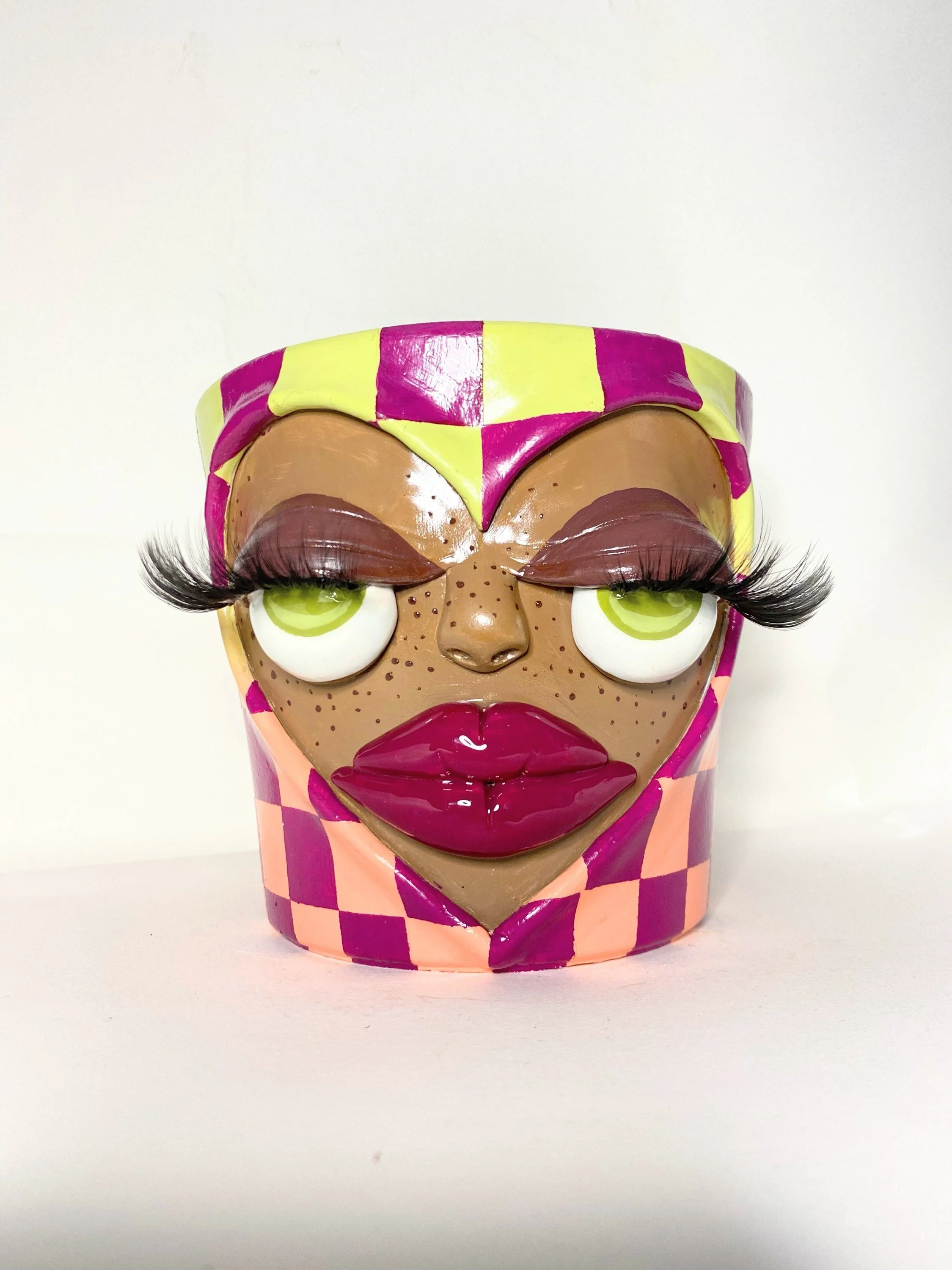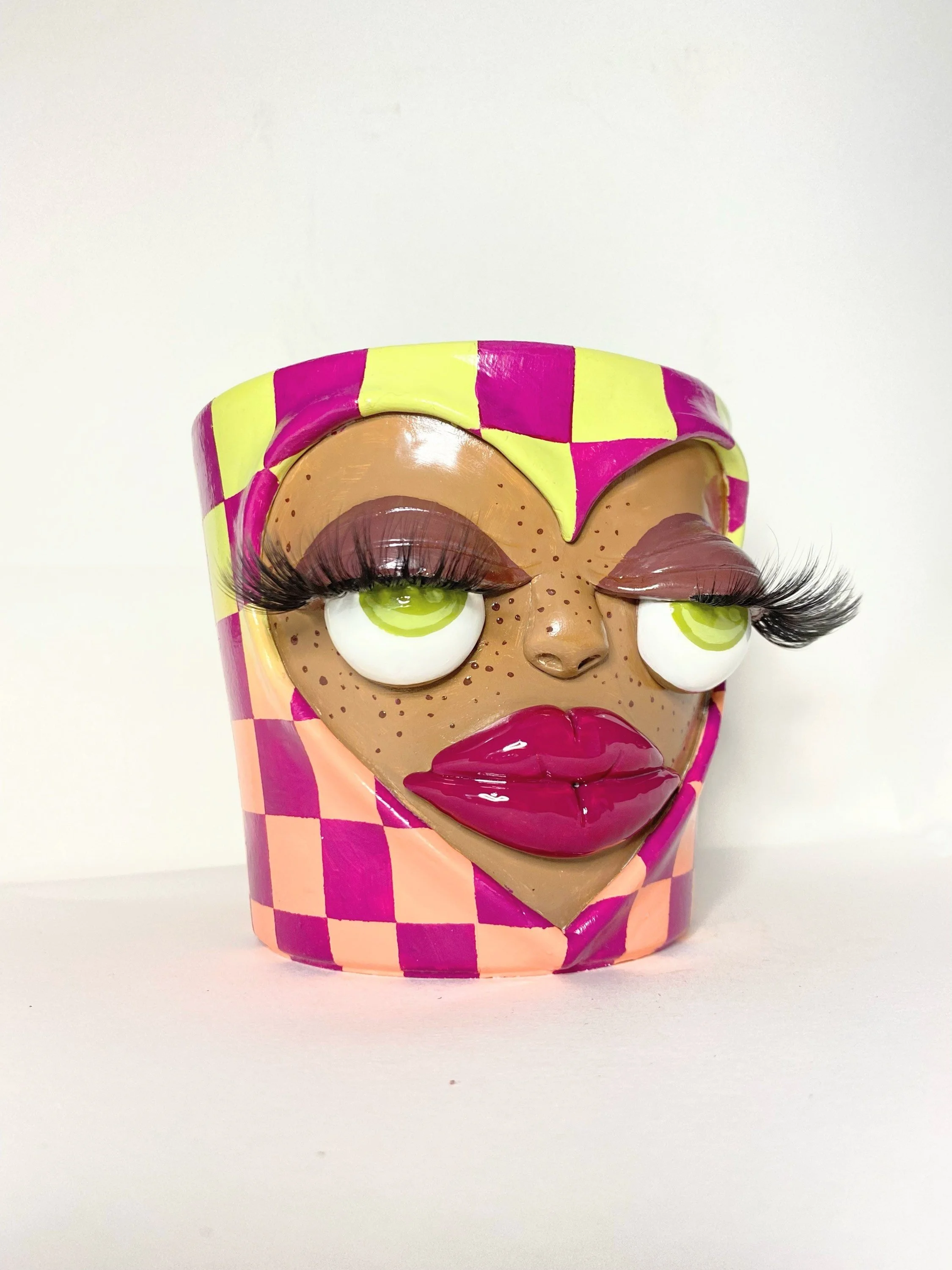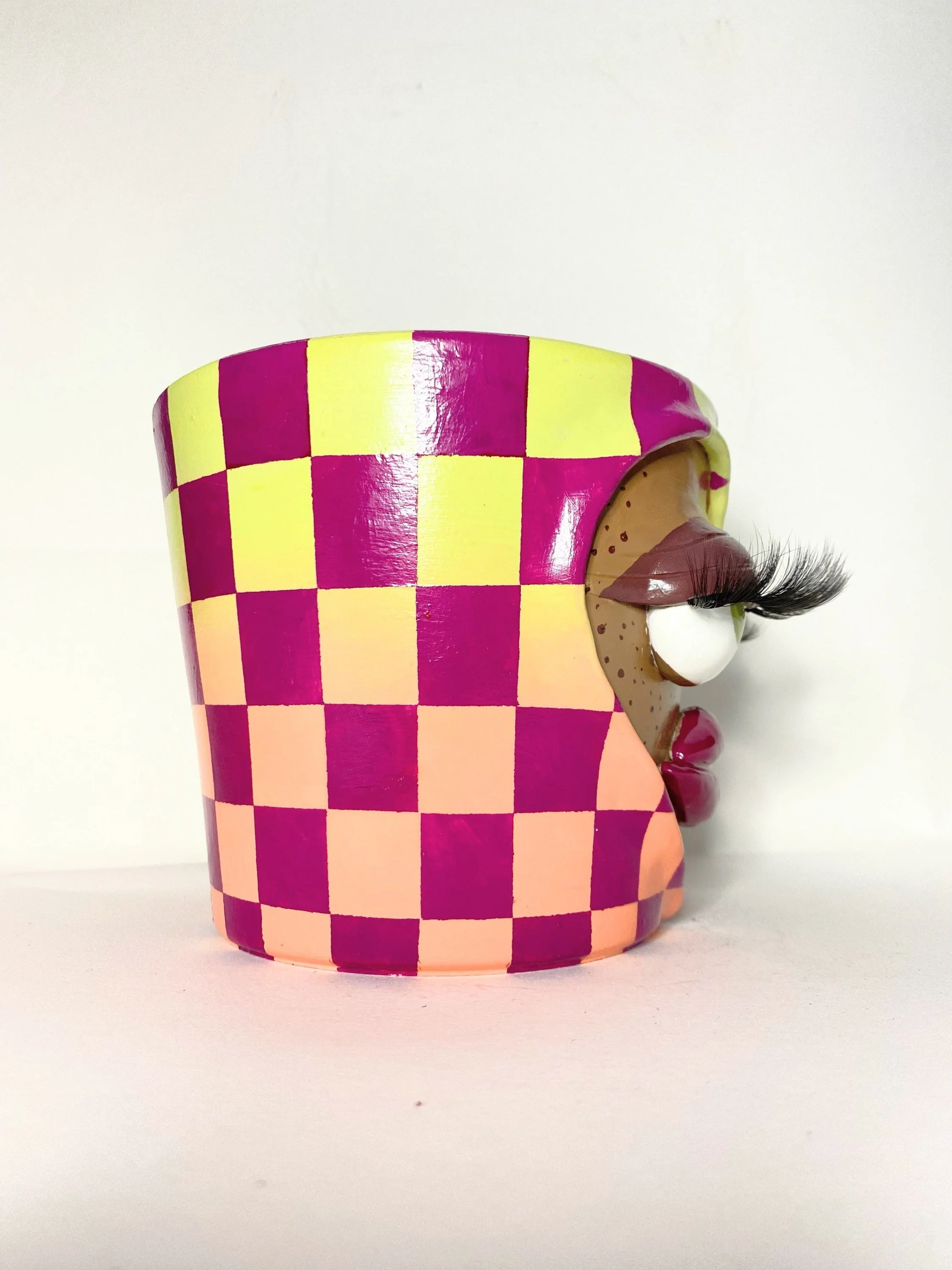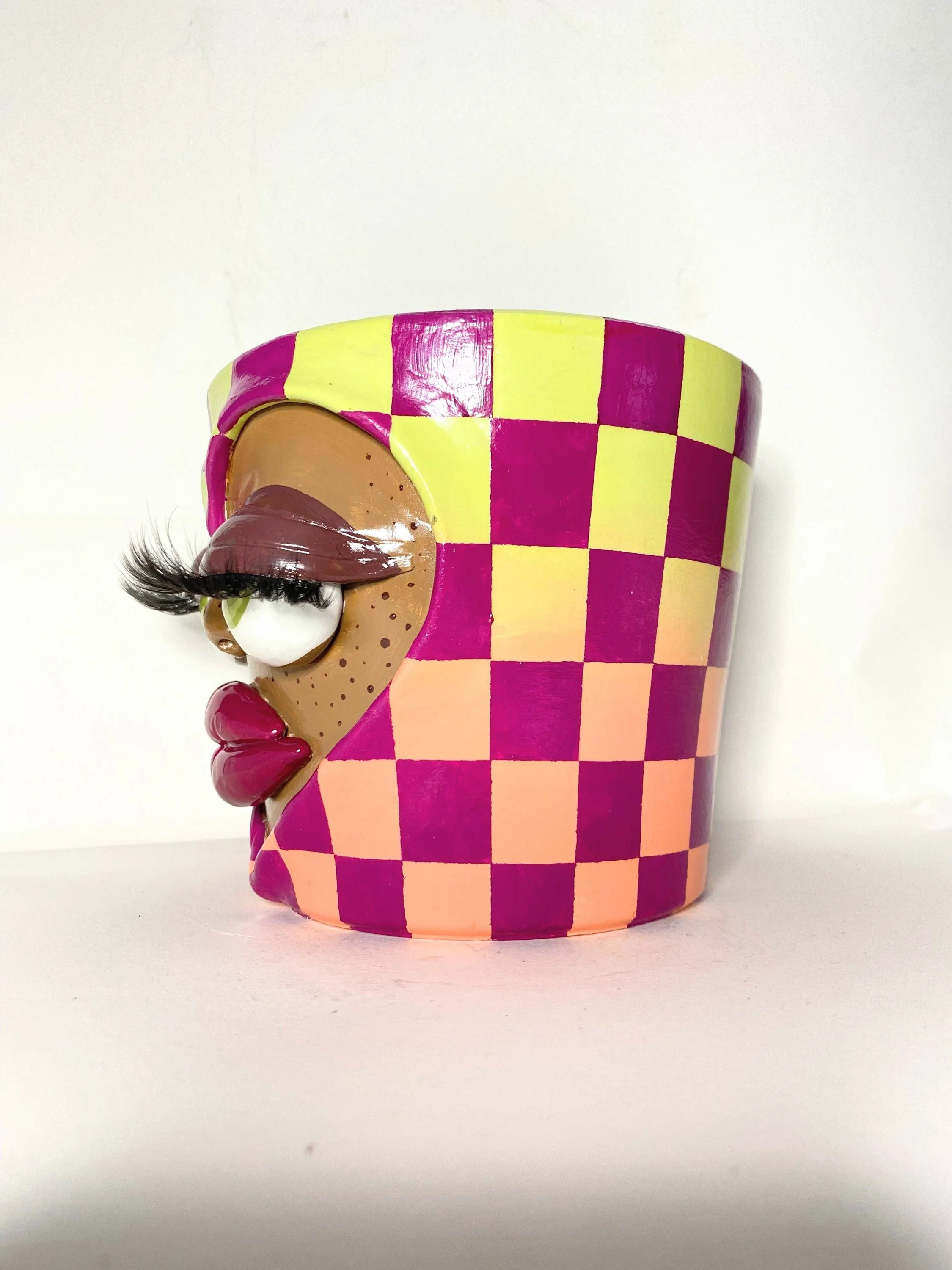 Terra cotta base, hand sculpted and painted with lots of love. :-) Featuring a drainage hole on the bottom, and a gloss finish. Plant NOT included.