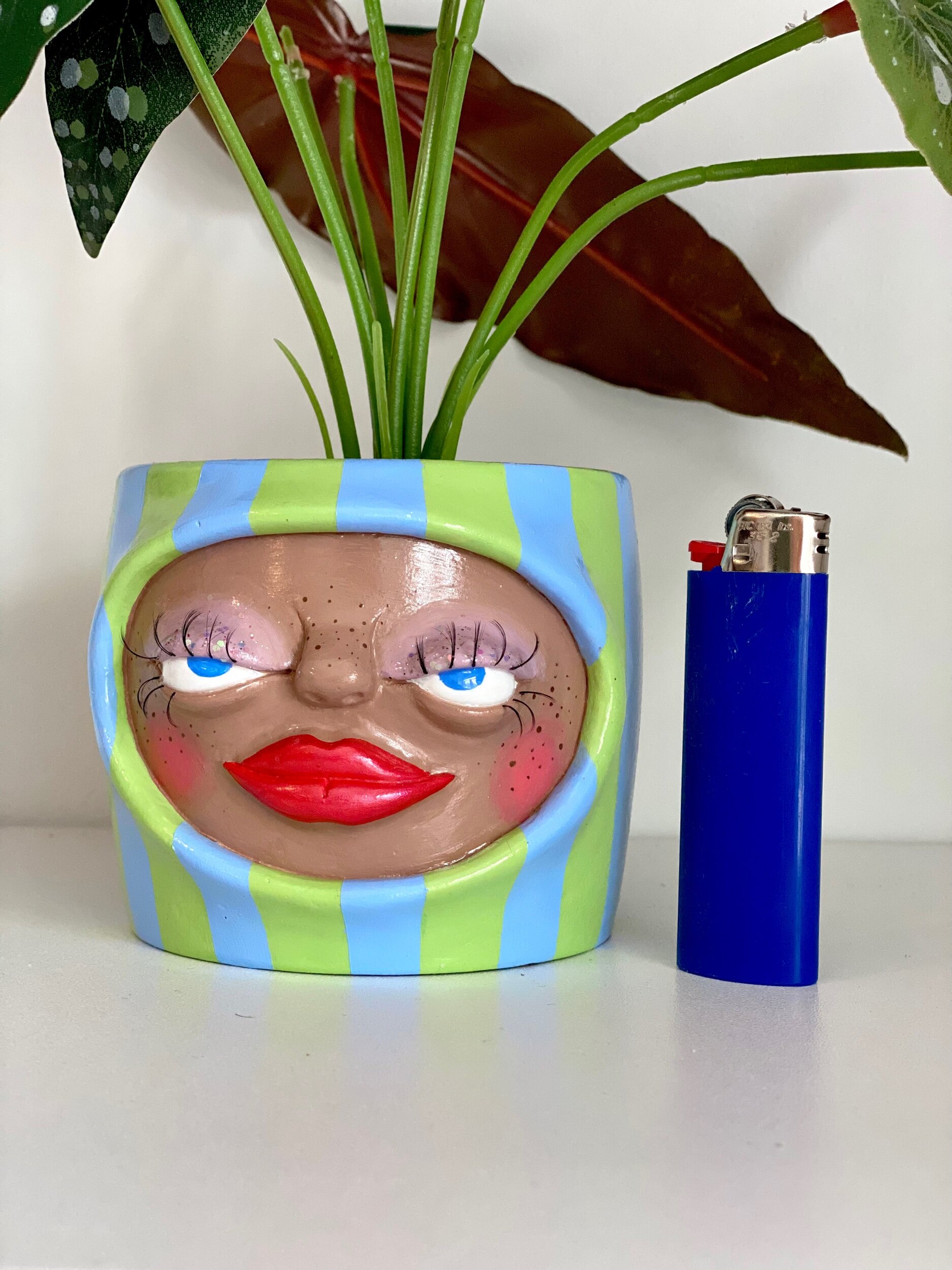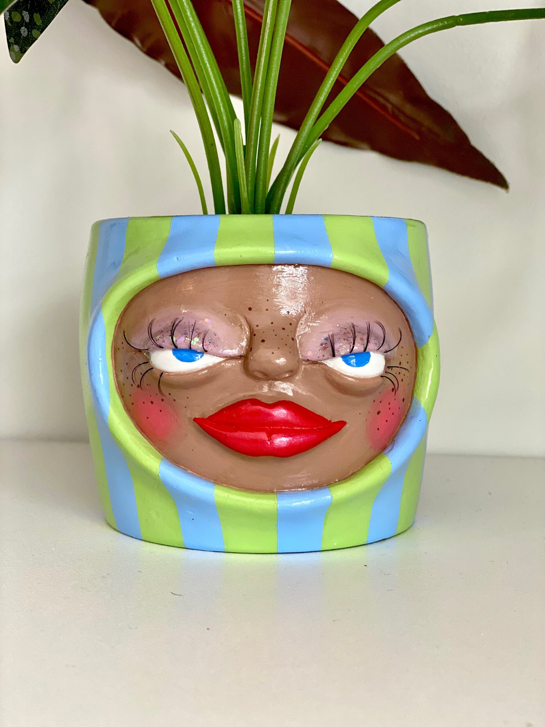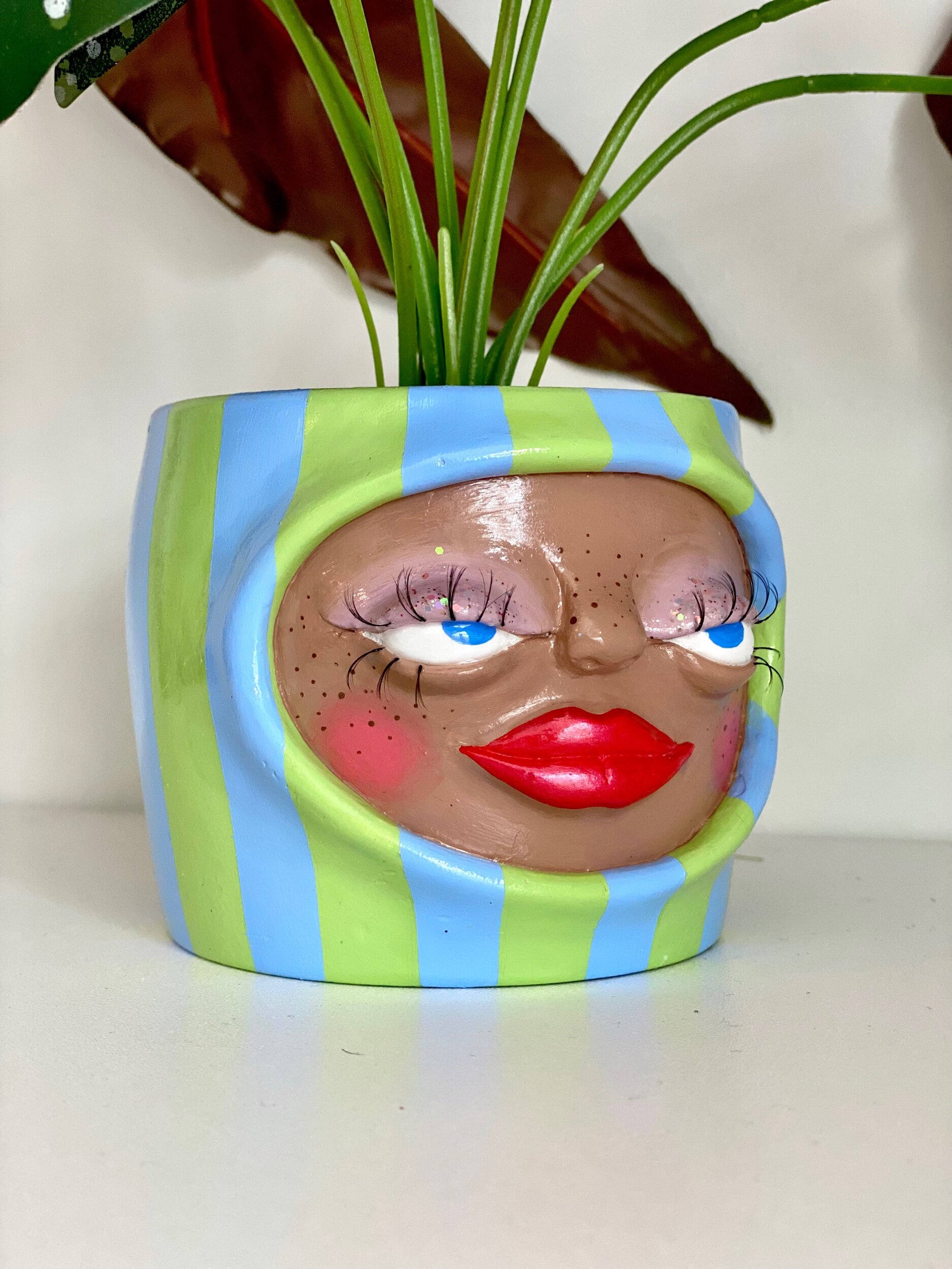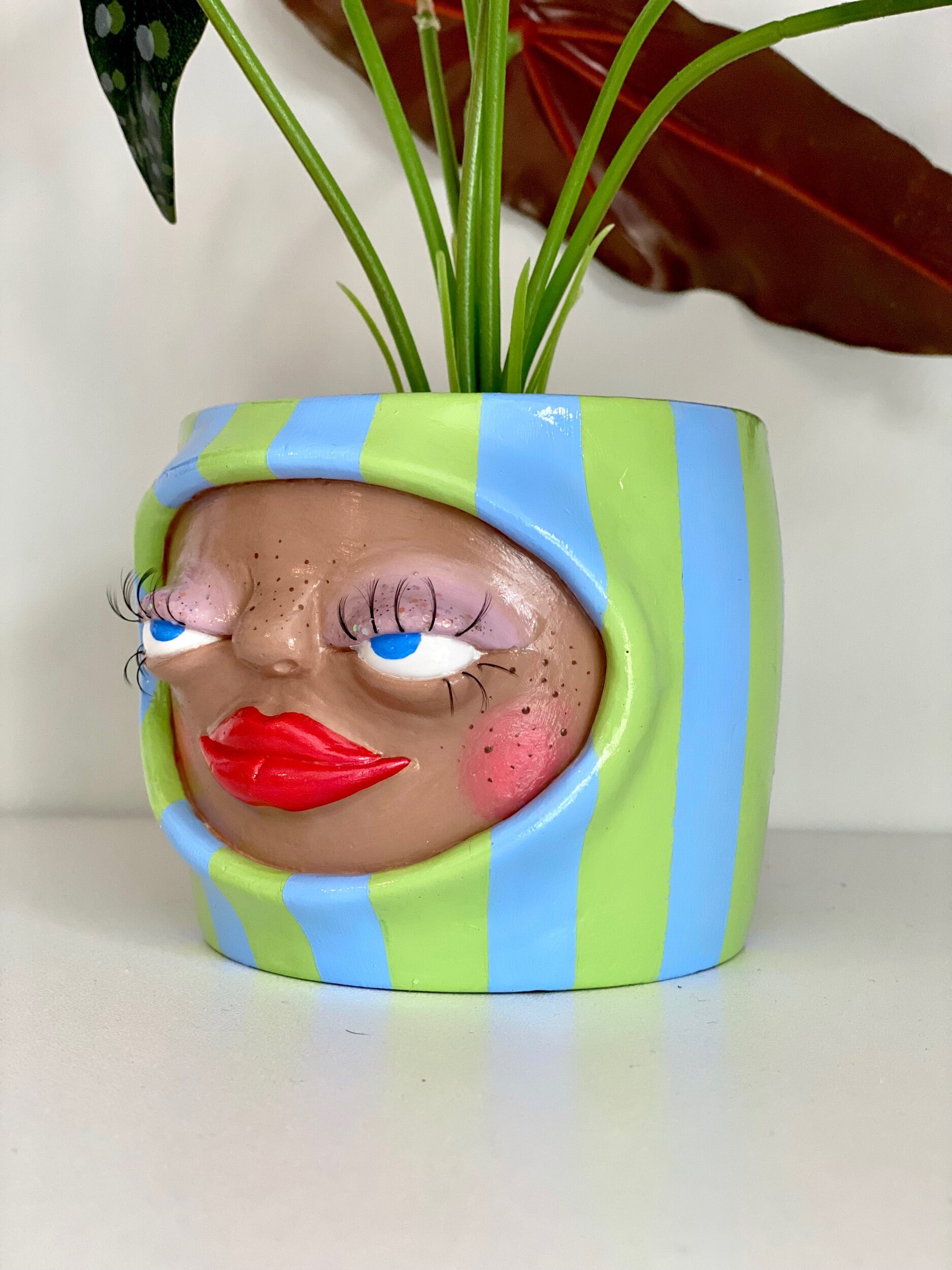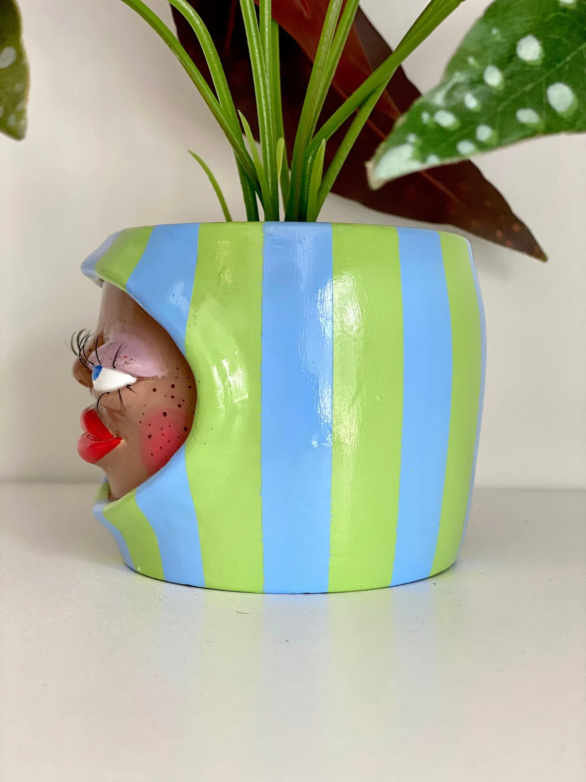 A cement planter with a drainage hole on the bottom. Hand painted with a gloss finish.
